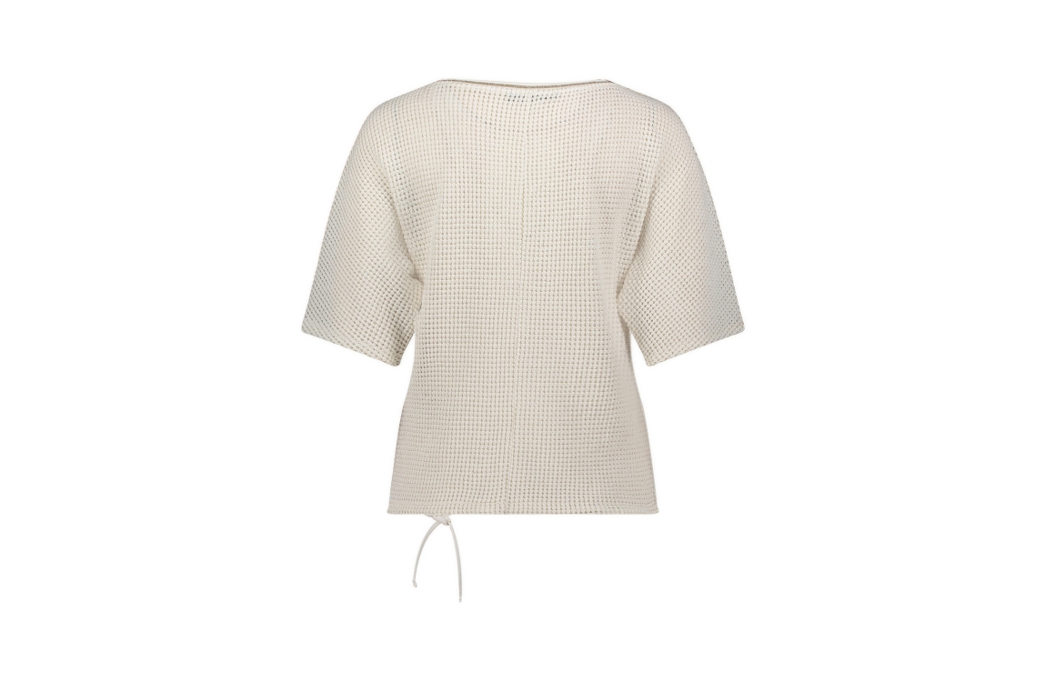 Betty Barclay sweater 27281730. Dit rechtvallend model is voorzien van een ronde hals afgewerkt met en gestreepte bies en heeft korte mouwen. Deze offwhite sweater van Betty Barclay is allover uitgevoerd in een structuur met een goudkleurige lurexdraadje. Dit model is afgewerkt met een trekkoord aan de onderzijde.