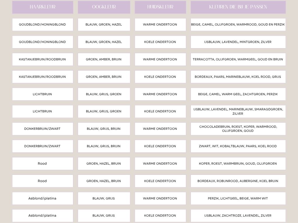 De kleuren die jou het mooist staan, worden grotendeels bepaald door de combinatie van je huidskleur, haarkleur en oogkleur. Huidskleur is de belangrijkste basis. Mensen met een warme ondertoon hebben vaak een huid met een gele, perzik- of goudachtige gloed. Bij hen staan aardetinten prachtig. Mensen met een koele ondertoon hebben meestal een roze, blauwe of neutrale gloed in hun huid. Zij komen het best tot hun recht in kleuren met een koele basis. Warme haarkleuren (zoals goudblond, koper of kastanjebruin) en ogen met een warme tint (zoals amber, hazelnoot of groen met goud) versterken warme kleurenpaletten.Koele haarkleuren (zoals asblond, zwart of koelbruin) en ogen met een grijze of blauwe ondertoon combineren juist mooi met koele kleuren.