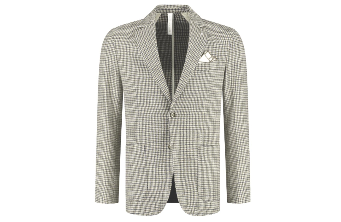Born with Appetite colbert BWA261038FA50 4001. Dit regular fit model heeft een reverskraag en lange mouwen. Deze zandkleurige colbert van Born with Appetite sluit aan de voorzijde door middel van knopen en is voorzien van twee opgestikte zakken en borstzak. Het model is all-over bewerkt met een ruitpatroon en is gedetailleerd met manchetknopen.