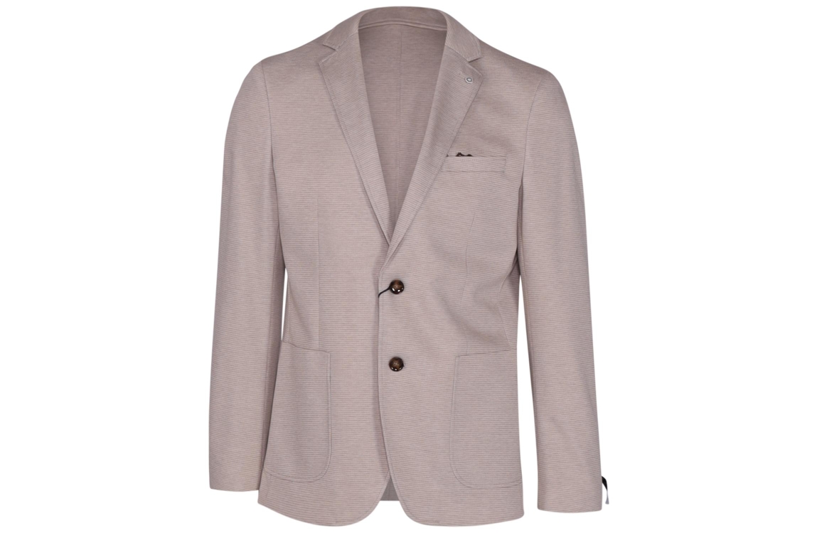 Born with Appetite colbert 251038fa85. Dit aangesloten model is voorzien van een reverskraag en heeft lange mouwen met 4 decoratieve knopen. Dit zandkleurige colbert van Born With appetite is bewerkt met een fijn klein pied de poule motief en is aan de voorzijde afgewerkt met een borstzakje voorzien van pochet en twee opgestikkte zakken. Dit model heeft twee splitten aan de achterzijde.