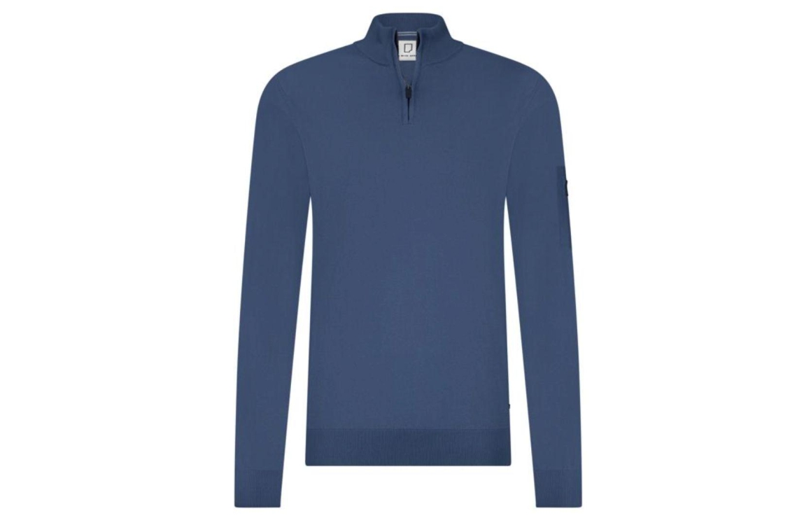 Born with Appetite Race Halfzip Pullover 268 Jeans blue. Dit rechtvallende model is voorzien van een opstaande kraag en heeft lange mouwen. Deze blauwe pullover van Born with Appetite sluit door middel van een rits aan de bovenzijde en is uitgevoerd in een fijn breisel. Dit model is voorzien van ribgebreide boorden.