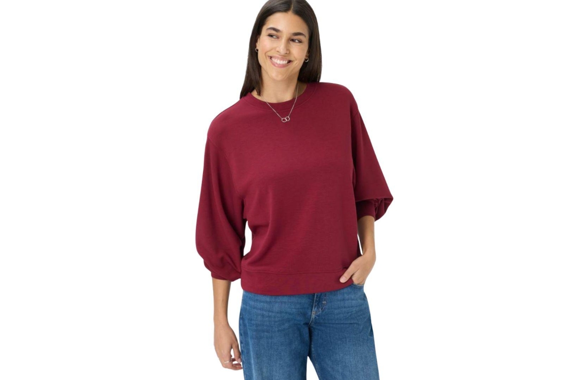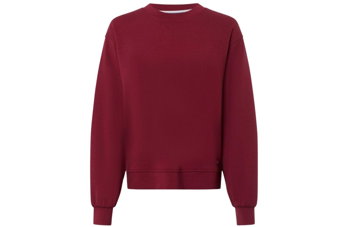 Brax trui 37-6608 90652600 40. Dit soepelvallende model heeft een ronde halslijn en lange mouwen. Deze bordeauxrode trui van Brax is uitgevoerd in een stretchkwaliteit en afgewerkt met boorden.