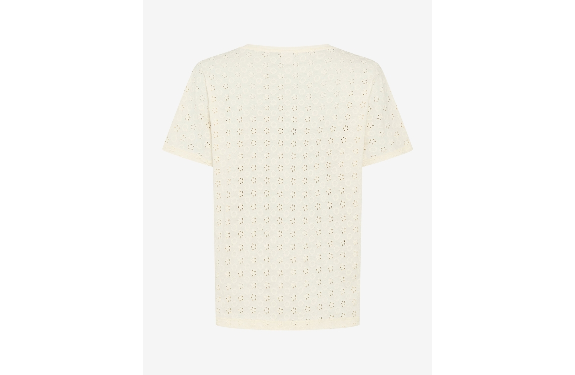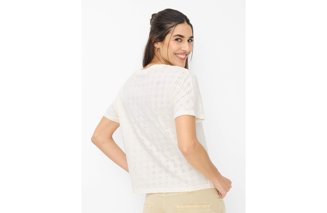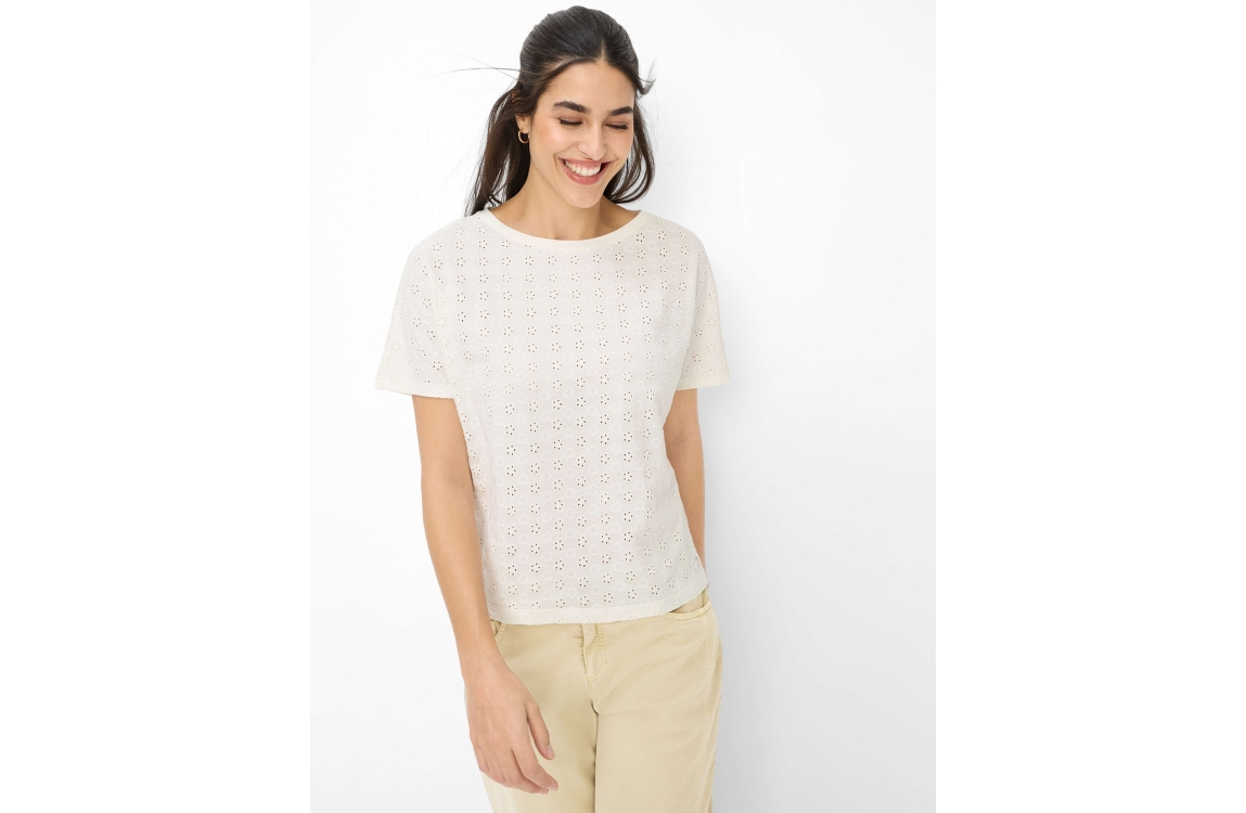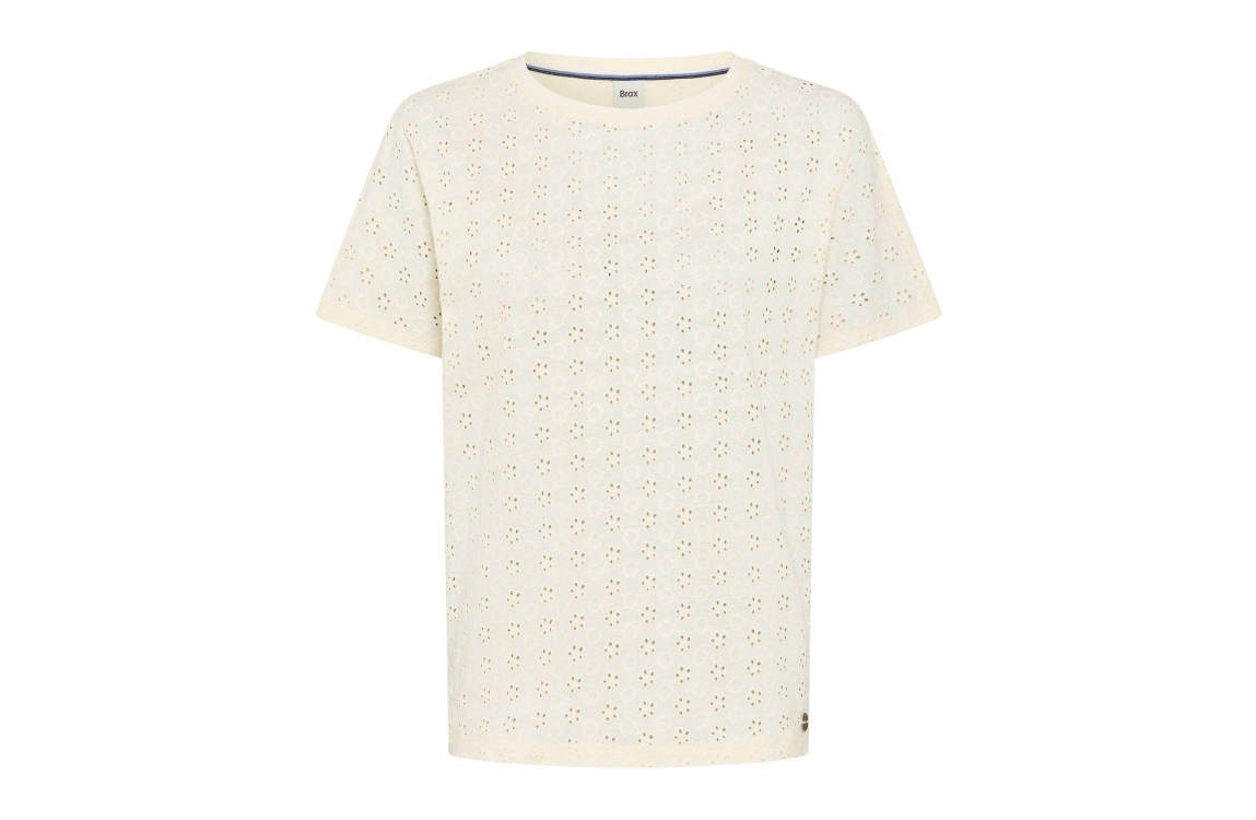 Brax STYLE.CAELEN.S 95 Soft ecru. Dit rechtvallende model is voorzien van een ronde hals en heeft korte mouwen. Deze ecru kleurige top van Brax is allover bewerkt met een gaatjesborduurwerk.