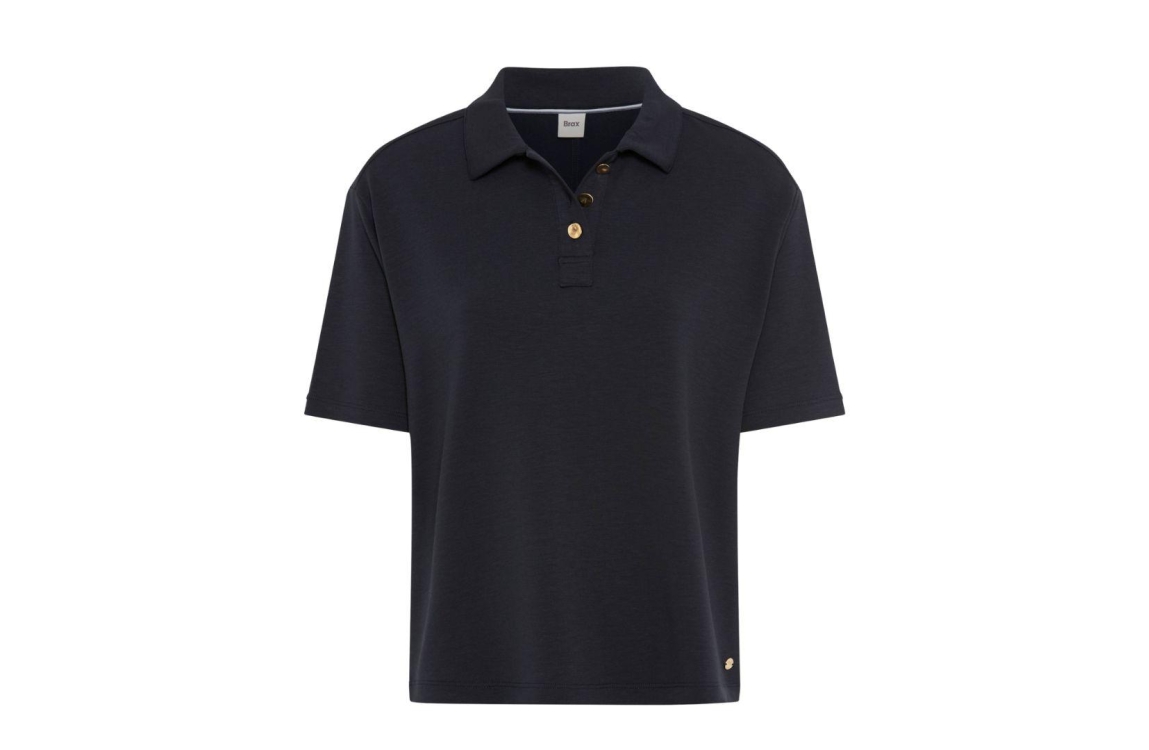 Brax polo Cara 22 Navy 90-0039 90660600. Dit rechtvallend model is voorzien van een kraag en heeft korte mouwen. Deze donkerblauwe polo van Brax sluit aan de bovenzijde van goudkleurige knopen.