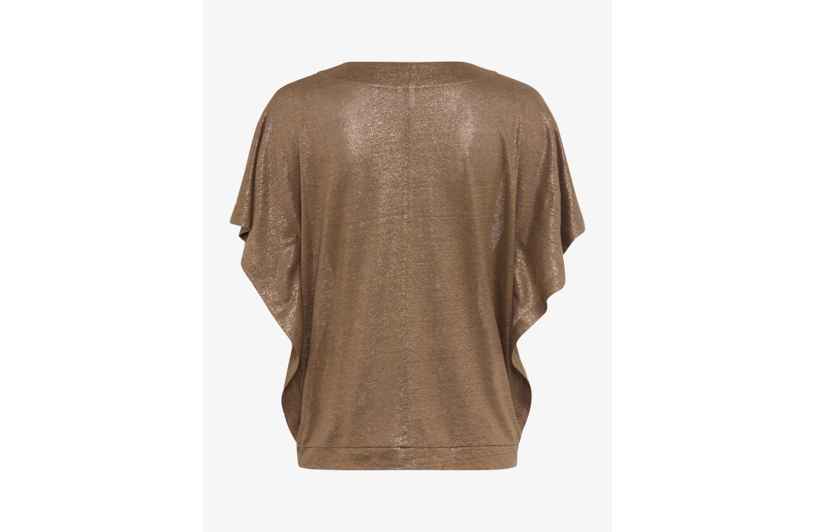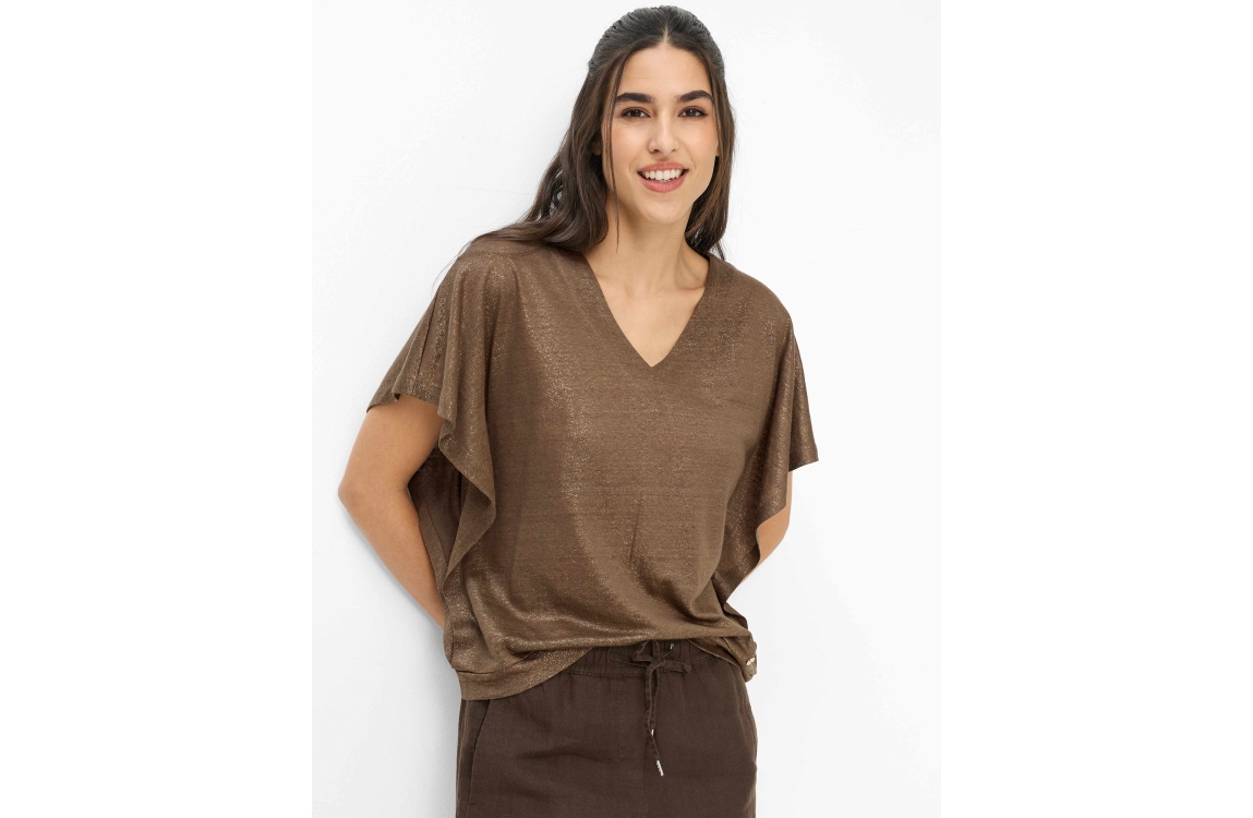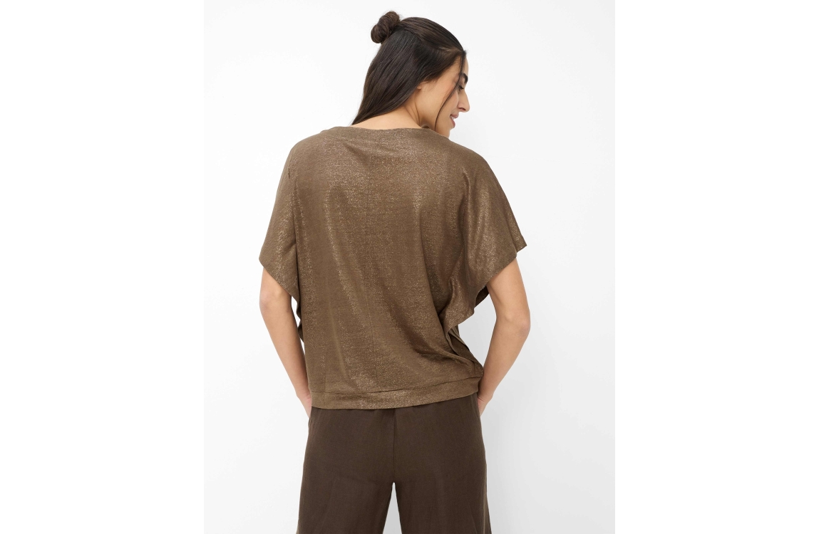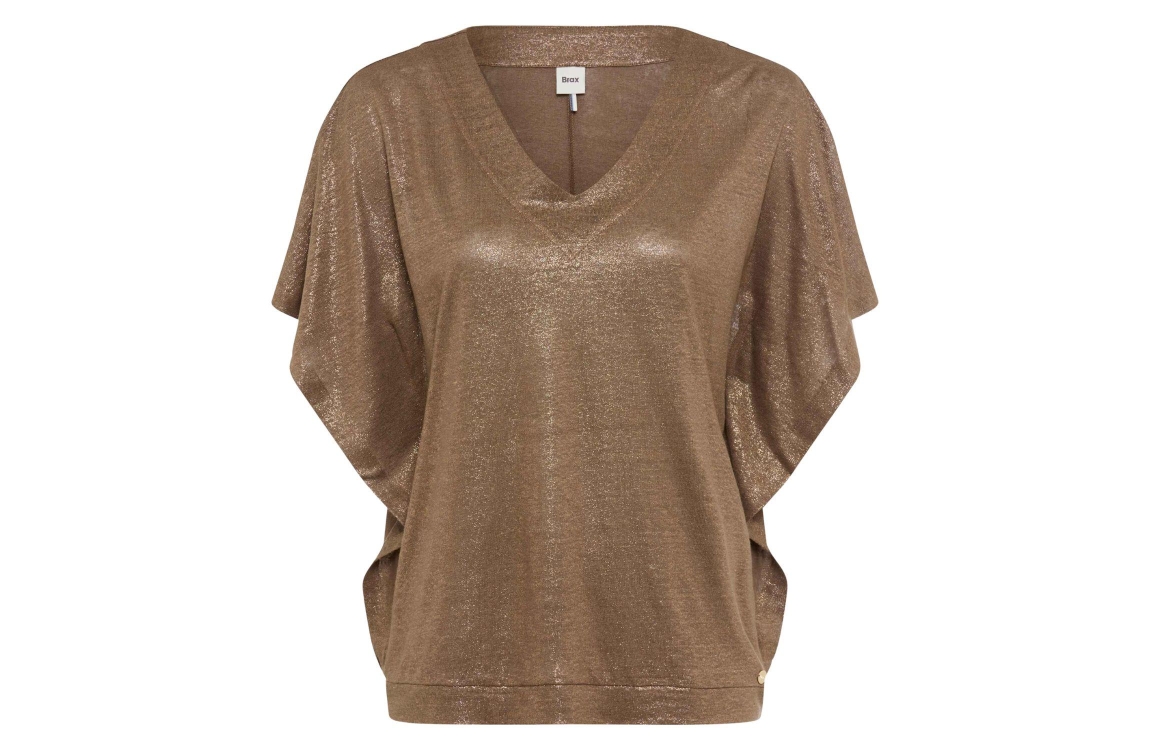 Brax STYLE.CASSIE.S 53 Mocha brown. Dit soepelvallende model is voorzien van een v-hals en heeft korte wijde mouwen. Deze bruine top van Brax is all-over bewerkt met een glitter.