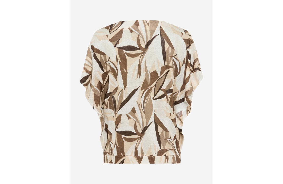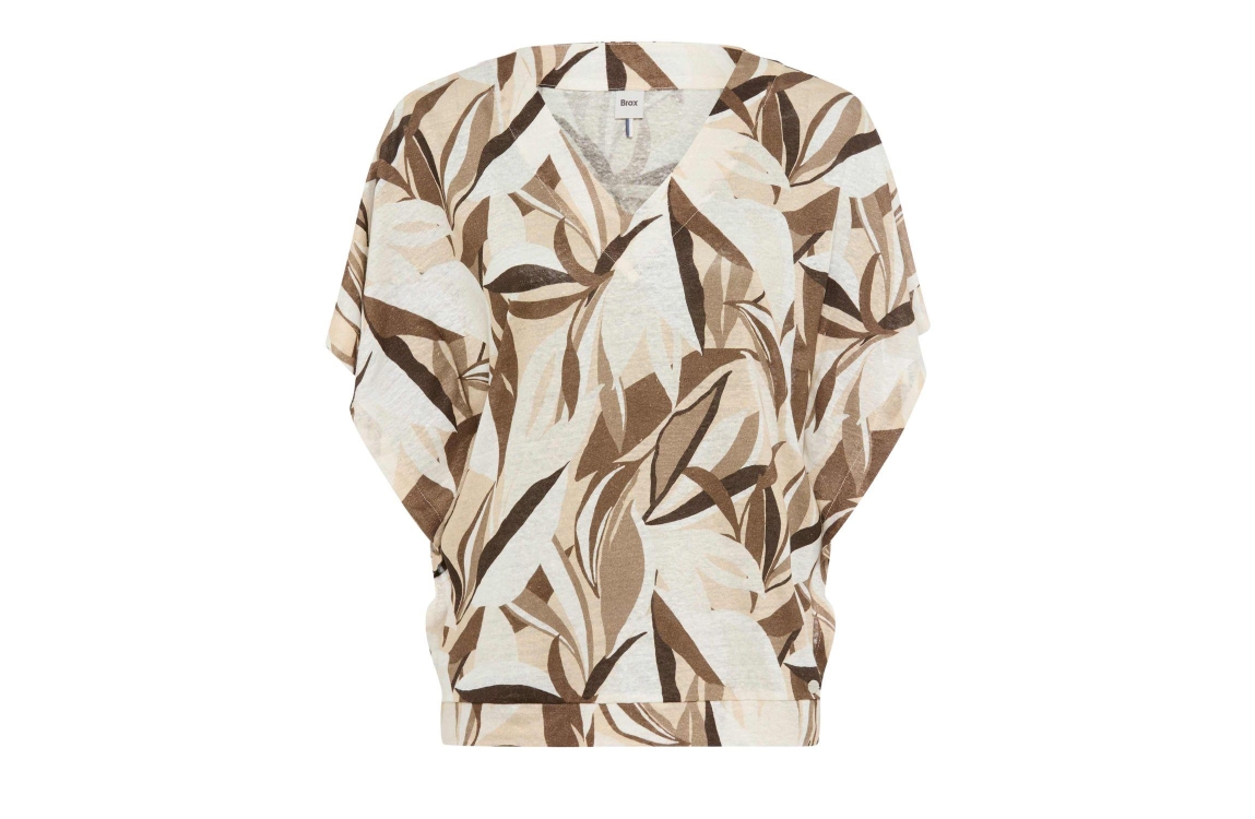 Brax STYLE.CASSIE.S 57 Sandshell. Dit soepelvallende model is voorzien van een v-hals en heeft korte mouwen. Deze multicolour top van Brax is all-over bewerkt met een print.