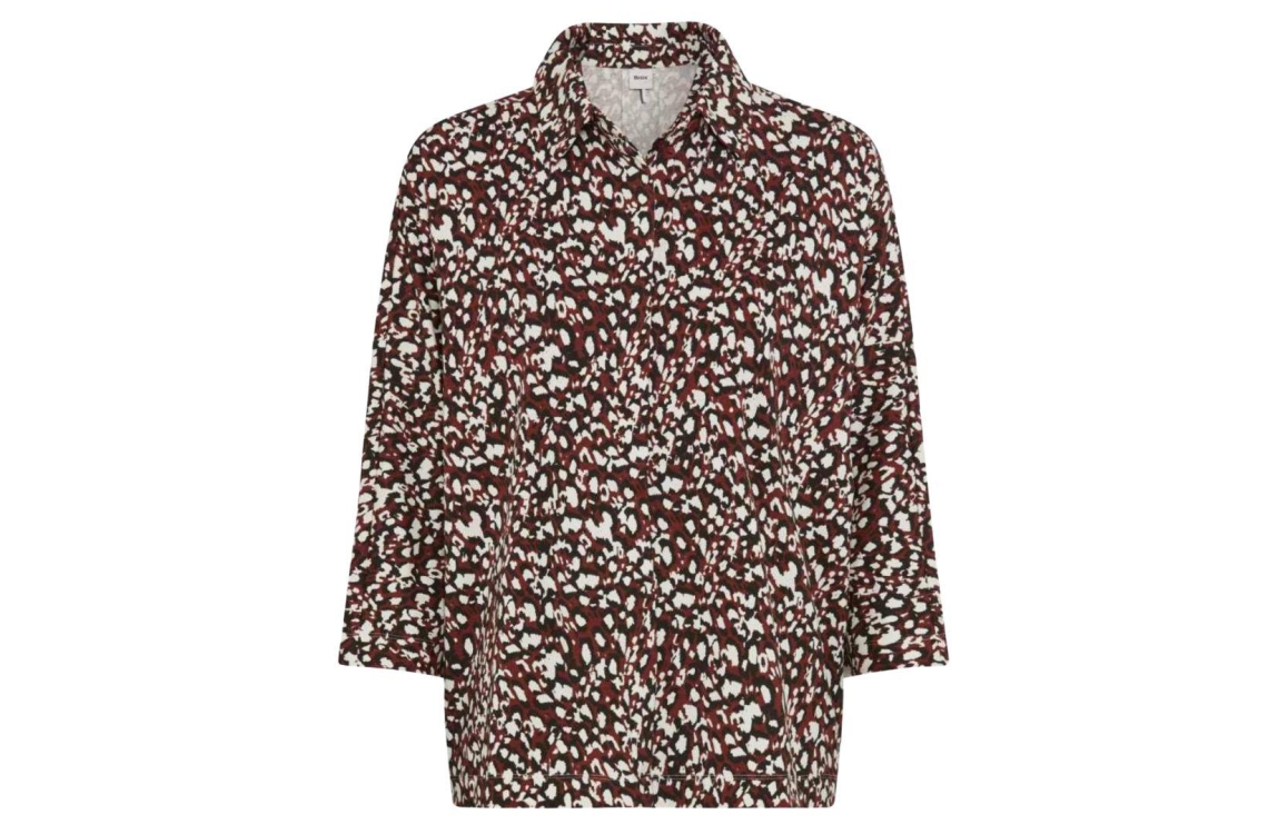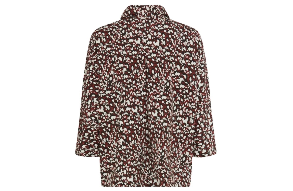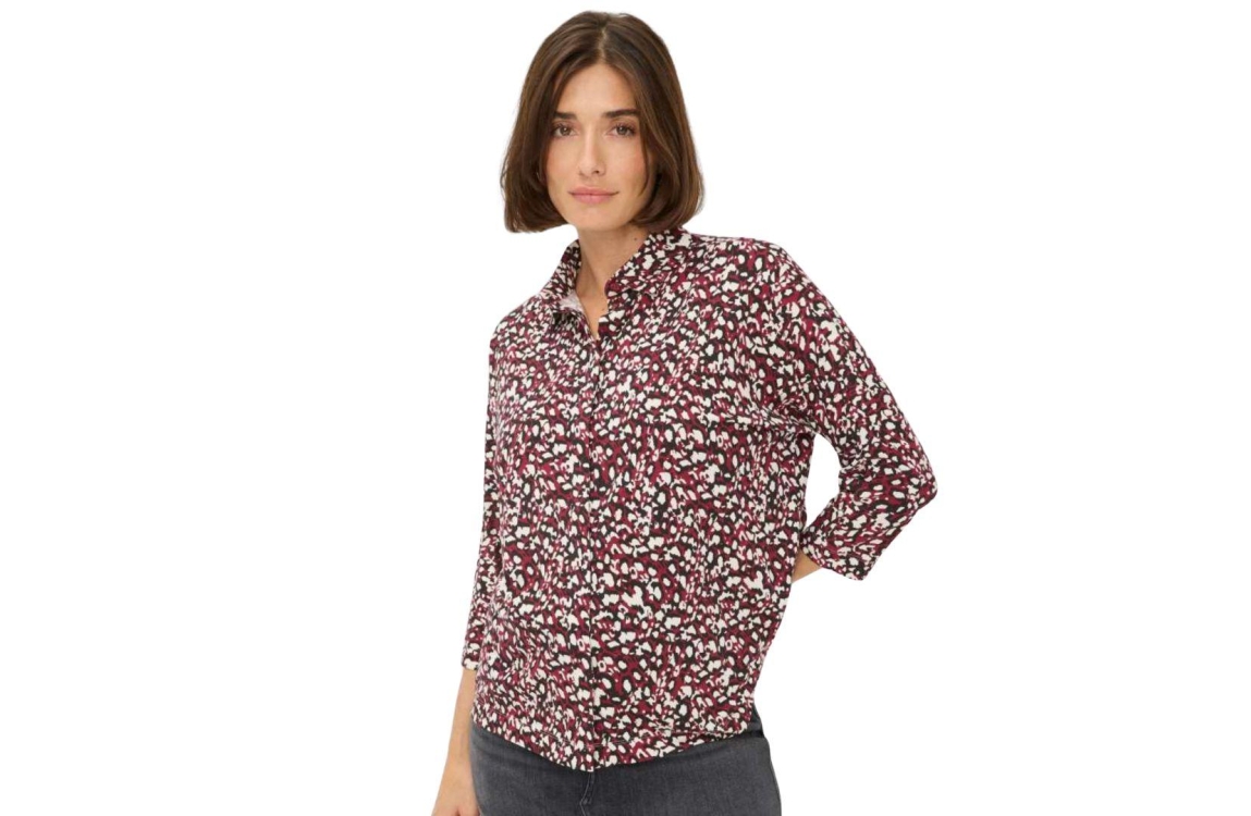 Brax blouse 31-3647 90653800. Dit rechtvallende model heeft een kraag en driekwart mouwen. Deze bordeauxrode blouse van Brax is all-over voorzien van een grafische print in verschillende kleuren en sluit aan de voorzijde met een blinde knoopsluiting.