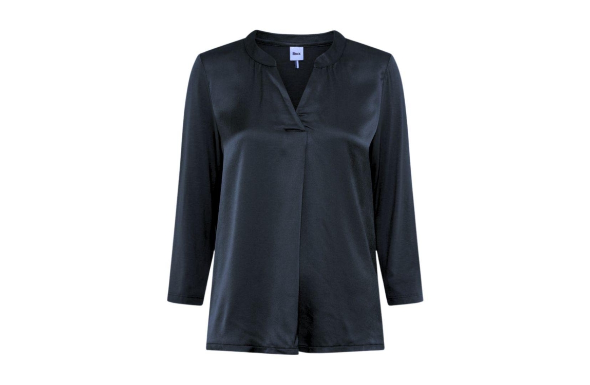 Brax shirt Clarisa 31-4437. Dit rechtvallend model is voorzien van een ronde hals met v-inkeping en heeft driekwart mouwen. Deze navy shirt van Brax is bewerkt met een glanzende stof aan de overzijde.