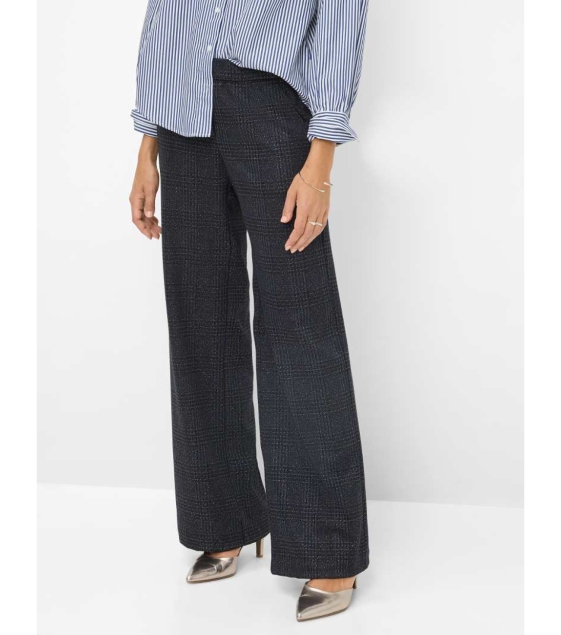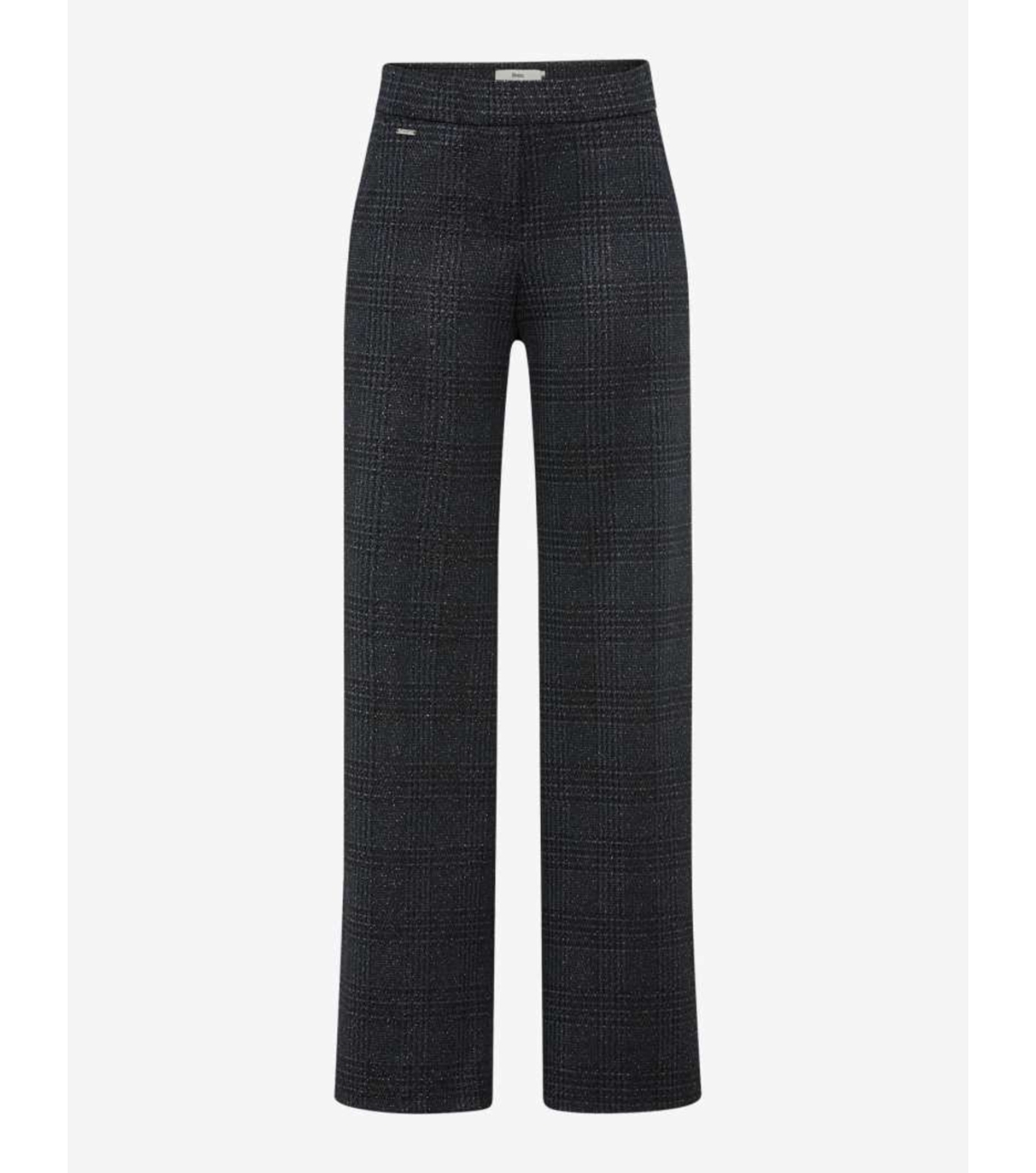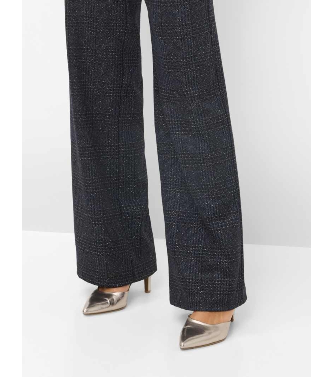 Brax STYLE.MAINE 77-5688/23. Dit rechtvallend model sluit door middel van een elastische boord. Deze donker blauwe broek van Brax is bewerkt met een grafisch patroon. Dit model is voorzien van twee steekzakken aan de voorzijde.