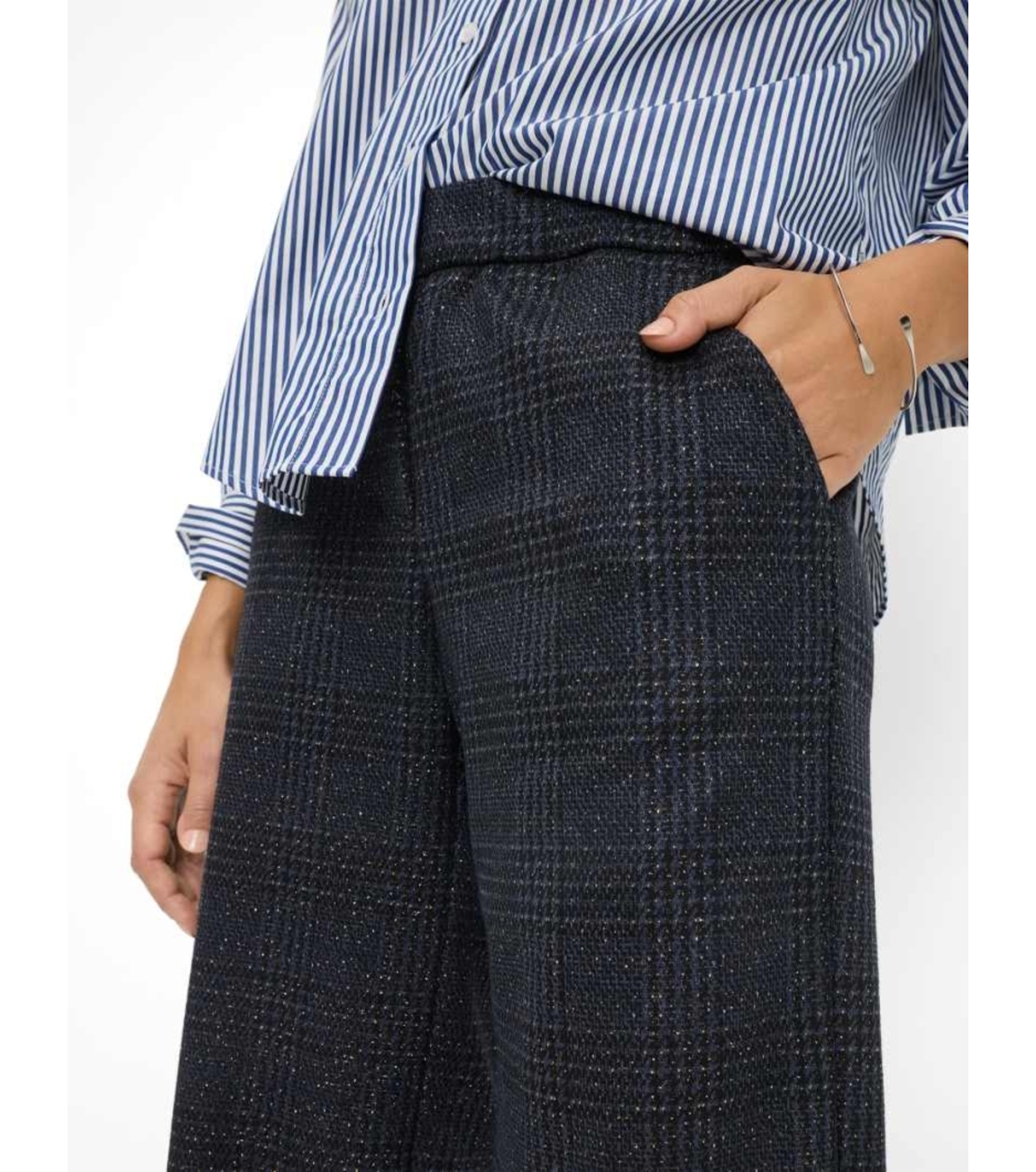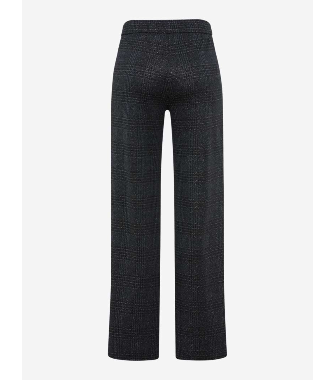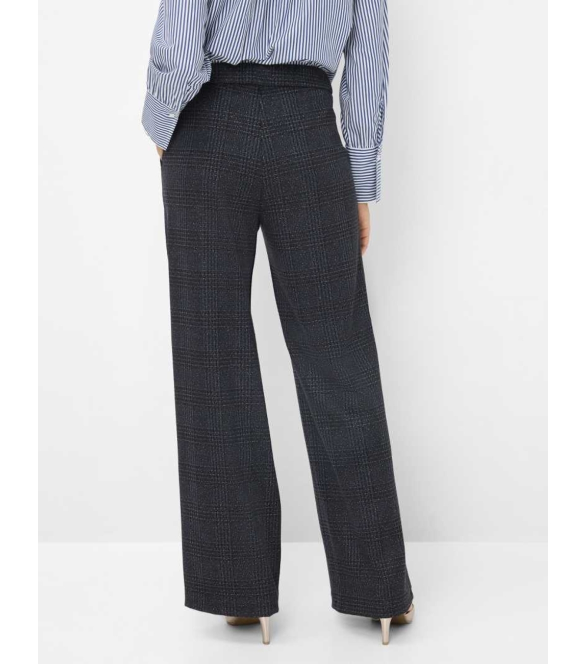 Brax STYLE.MAINE 77-5688/23. Dit rechtvallend model sluit door middel van een elastische boord. Deze donker blauwe broek van Brax is bewerkt met een grafisch patroon. Dit model is voorzien van twee steekzakken aan de voorzijde.