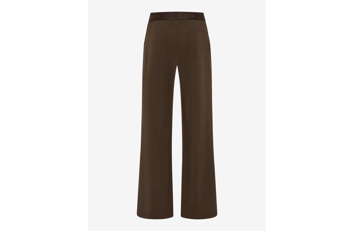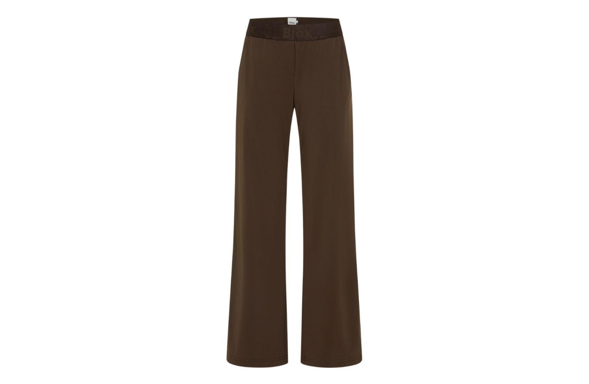 Brax broek Maine 09-5552 09287620. Dit bruine wide leg model sluit door middel van een elastische boord bewerkt met logo en beschikt over twee steekzakken aan de voor- en achterzijde.
