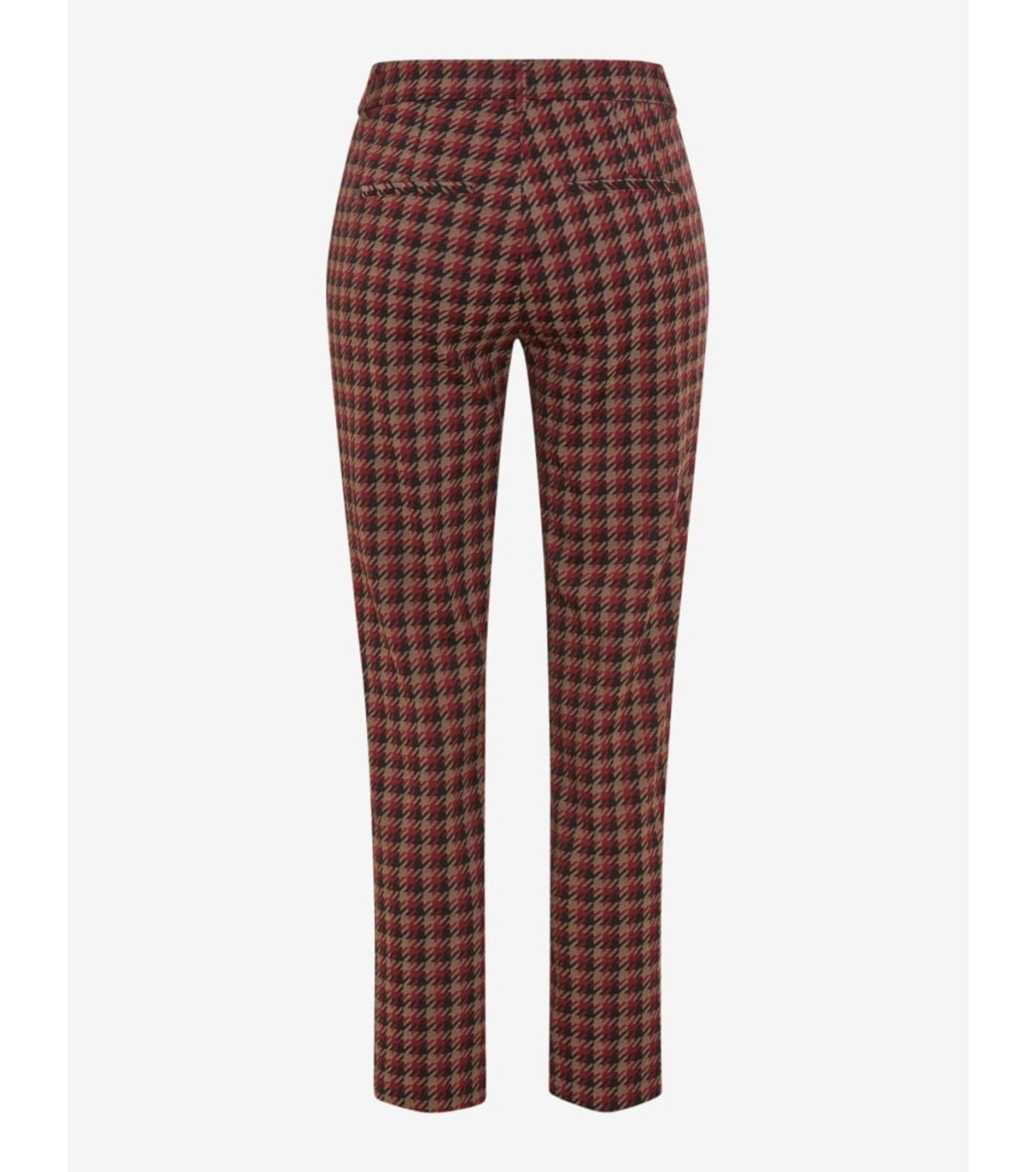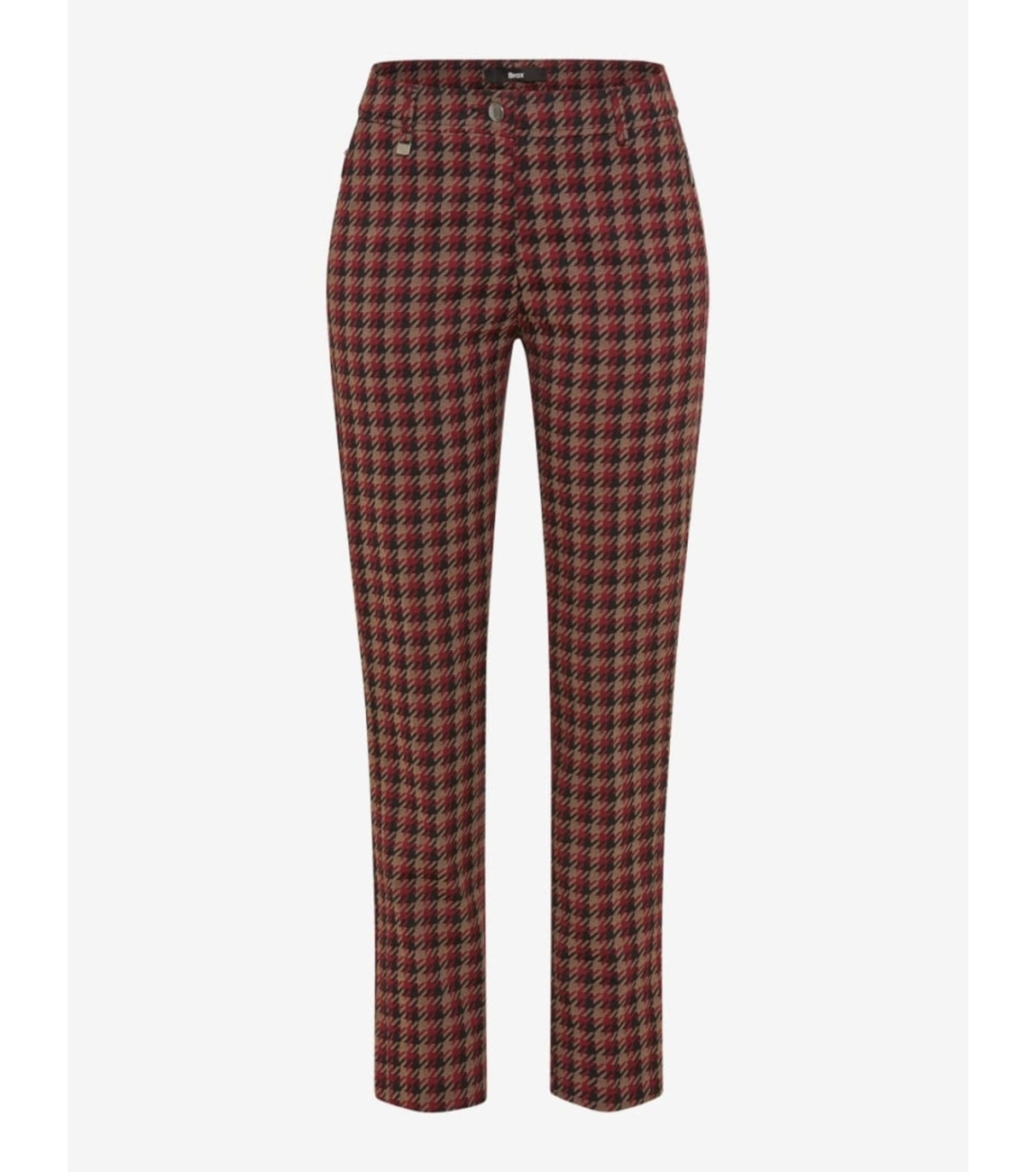 Brax STYLE.MARON 77-4348 09228920 broek. Het rechtvallend model sluit door middel van een knoop en een rits. Deze rood geruite broek van Brax beschikt over verschillende broekzakken.