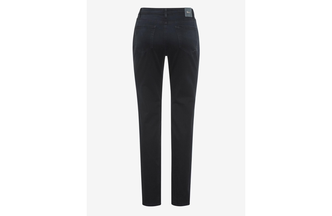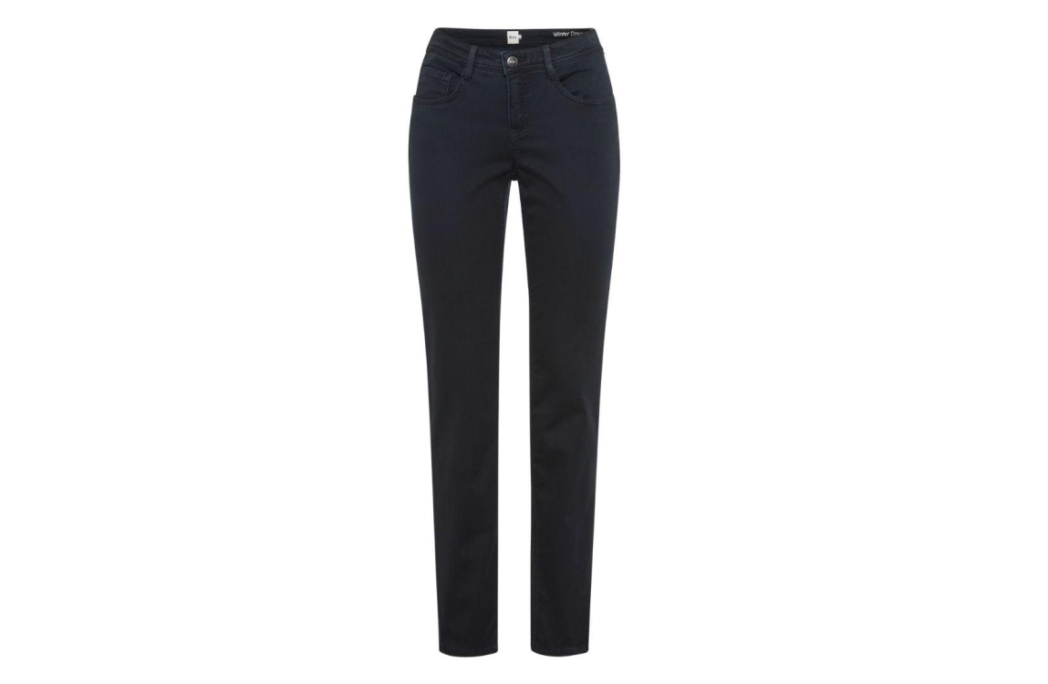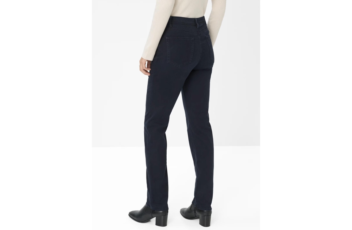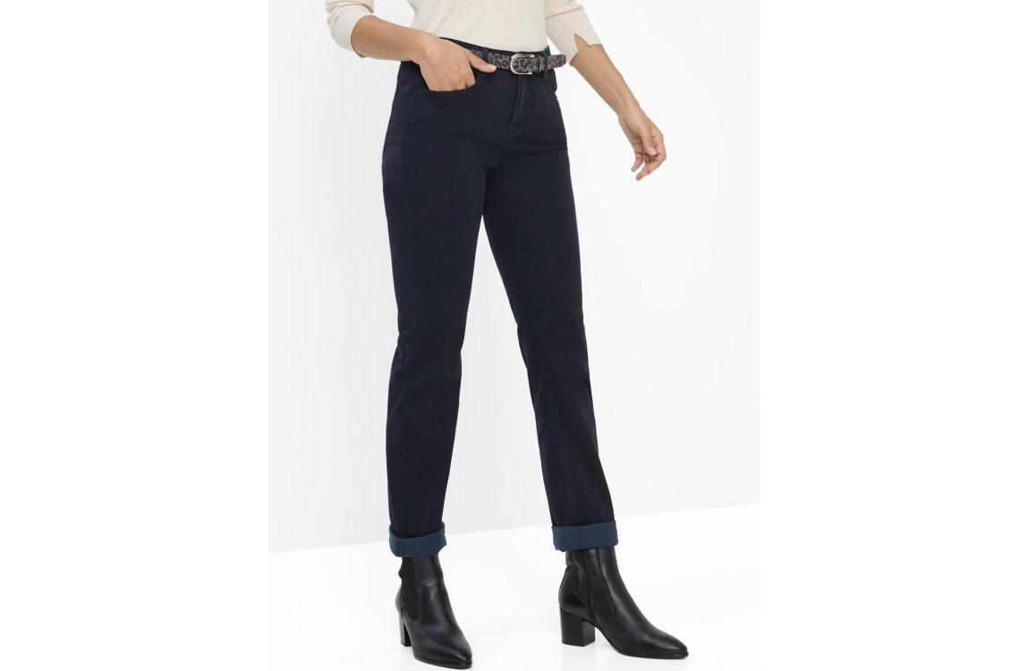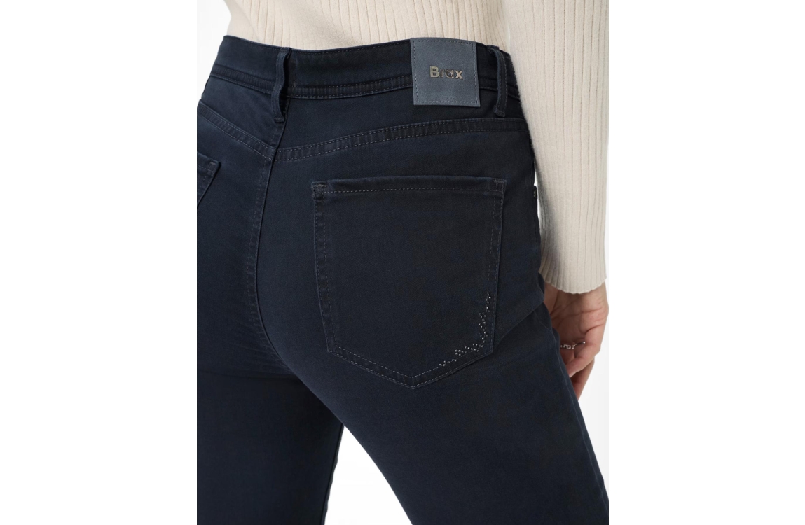 Brax STYLE.MARY 71-1707/22. Dit regular fit model sluit door middel van een knoop en ritsaansluiting en heeft ceintuurlussen. Deze navy Brax broek beschikt over twee steekzakken aan de voor- en achterzijde en heeft een muntenzakje. Deze broek is aan de achterkant afgewerkt met strass steentjes.