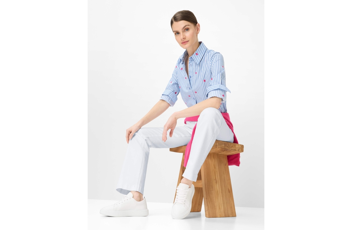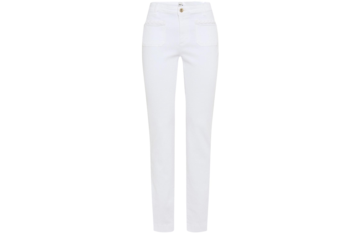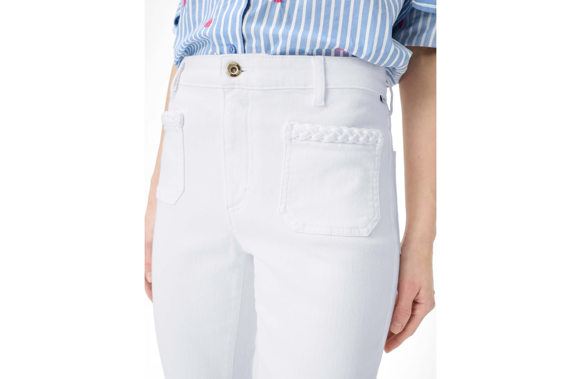 Brax broek Mary 09-6552 09976520. Dit bootcut model sluit door middel van een knoop en rits afgewerkt met ceintuurlussen. Deze witte broek van Brax beschikt over opgestikte zakken aan de voorzijde bewerkt met een gevlochten gestructuur en is voorzien van twee zakken aan de achterzijde.
