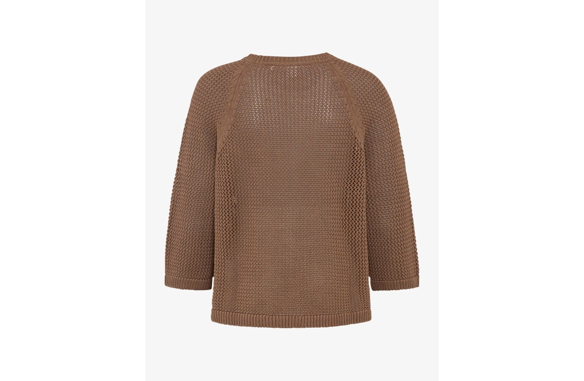 Brax pullover Nala 5353 mocha brown. Dit rechtvallend model is voorzien van een ronde hals en heeft driekwart mouwen. Deze bruine pullover van Brax is gehaakt uitgevoerd.