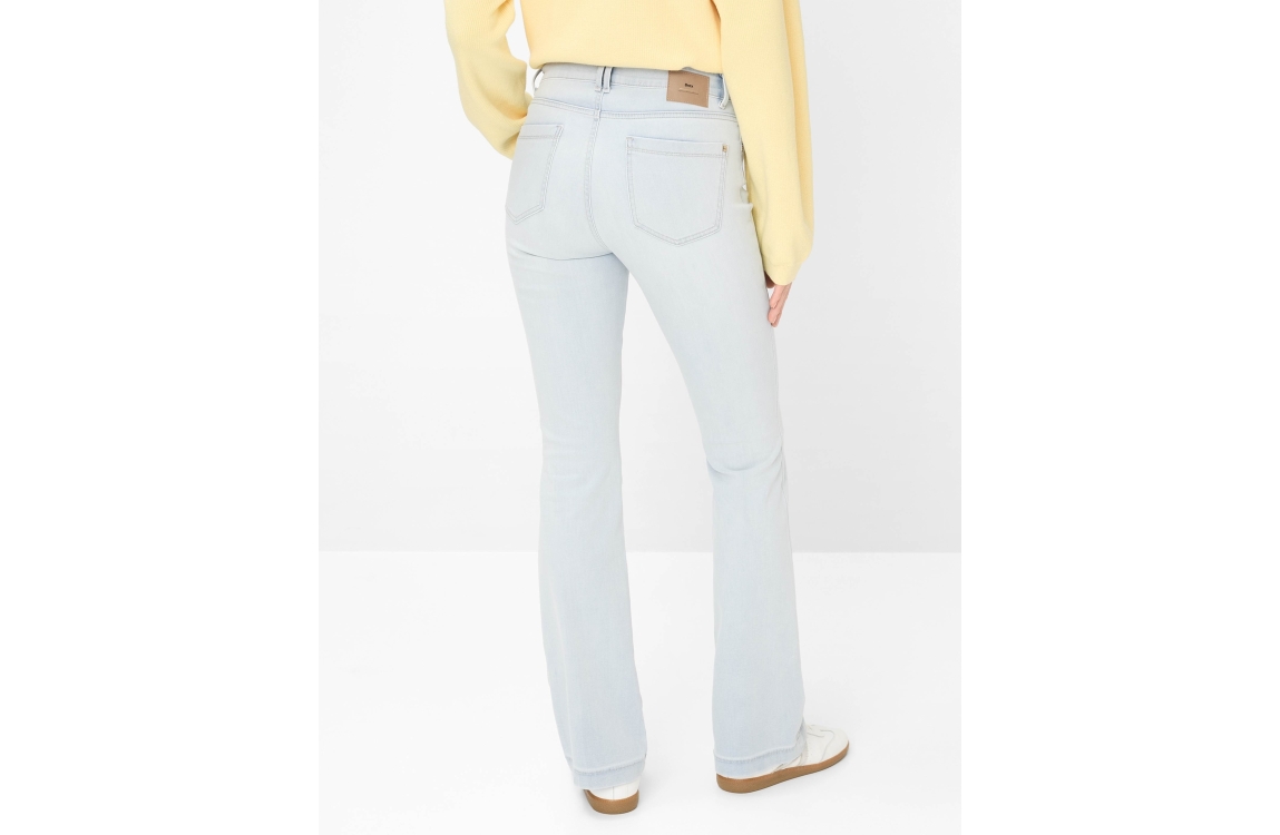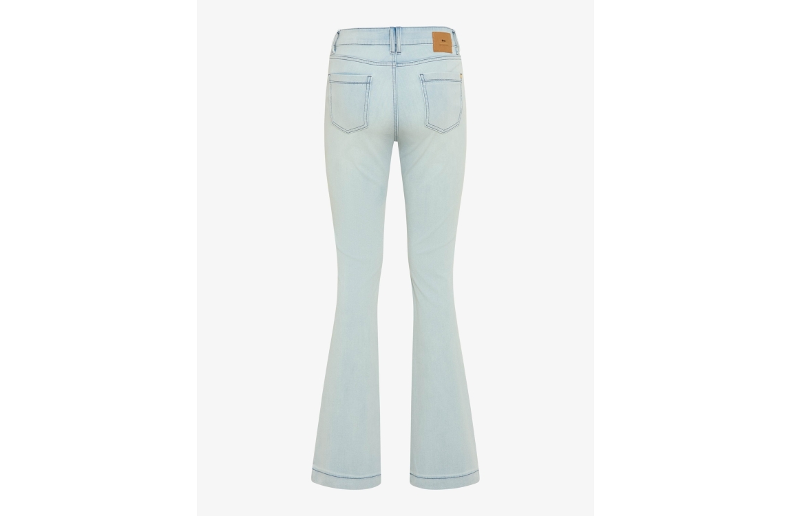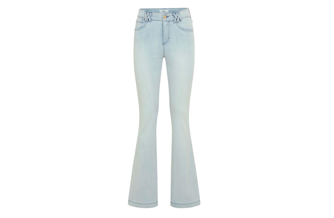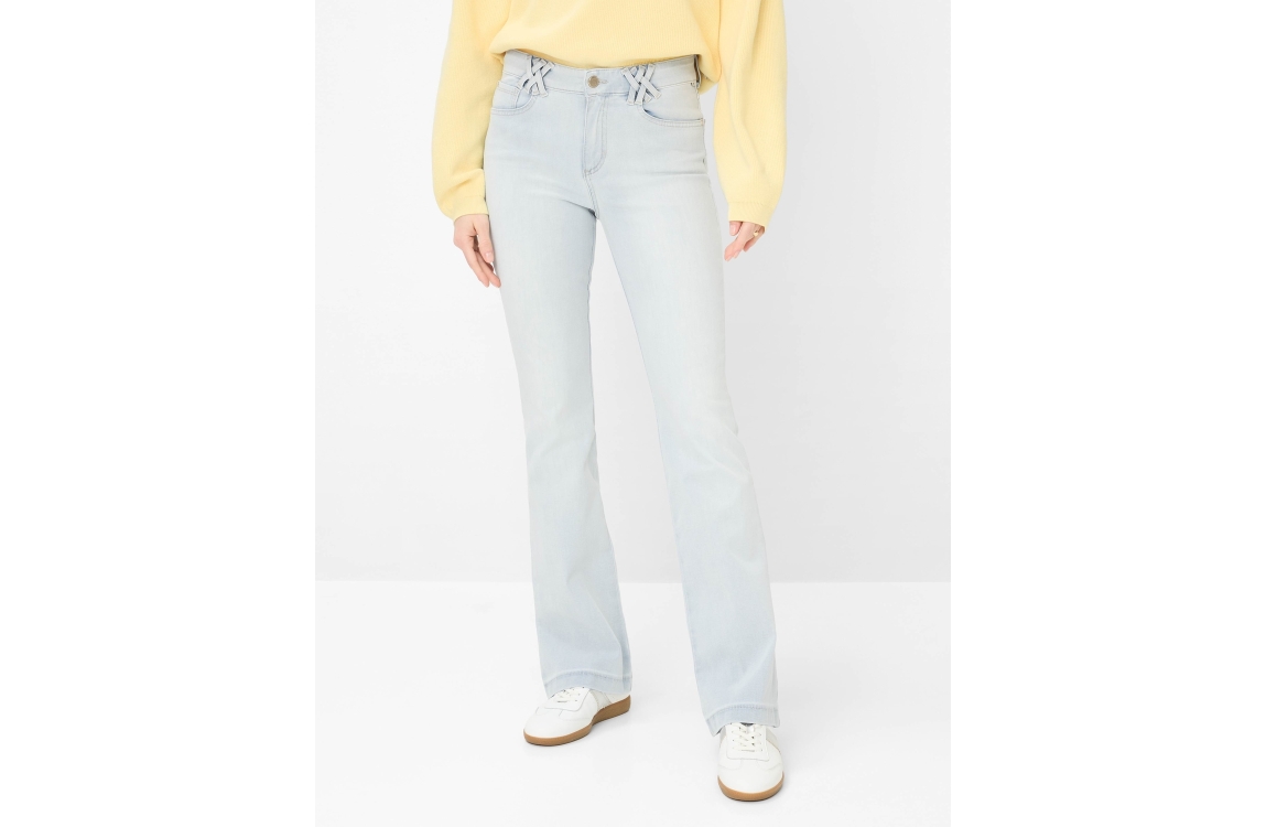 Brax jeans Shakira 09-6002 09985220. Dit bootcut model sluit door middel van een knoop en rits afgewerkt met ceintuurlussen waarbij de voorste twee lussen uitgevoerd is in een vlecht structuur. Deze bleached blauwe jeans van Brax is beschikt over 5 zakken.