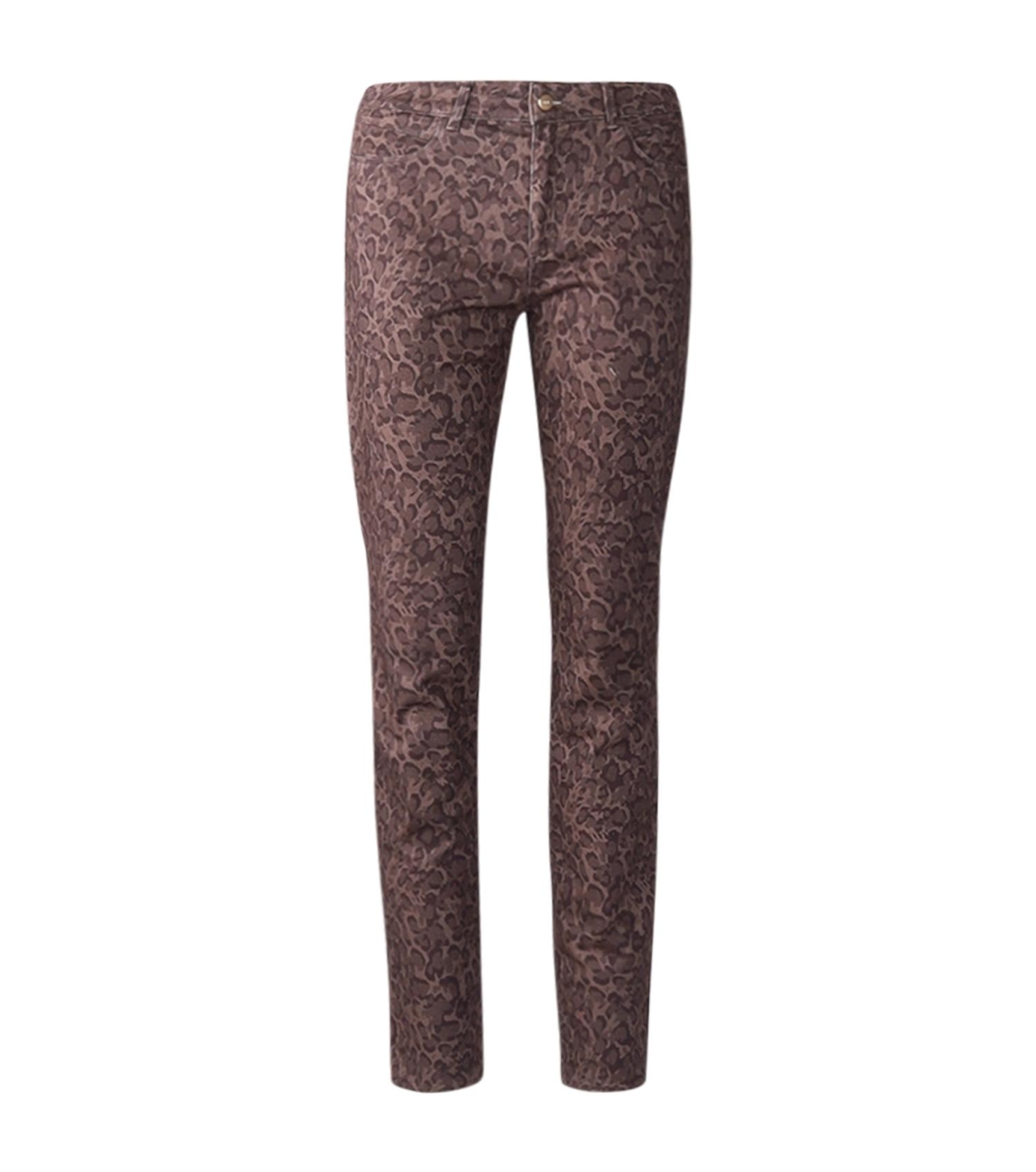Brax broek STYLE.SHAKIRA 77-1728/52. Dit regular fit model sluit door middel van een knoop en ritsaansluiting en heeft ceintuurlussen. Deze bruine Brax broek bewerkt met panter print. Dit model beschikt over twee steekzakken aan de voor- en achterzijde.
