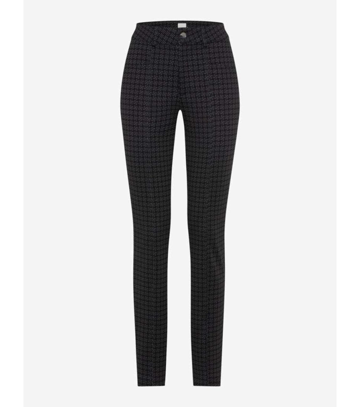 Brax STYLE.SHAKIRA S. Dit regular fit model sluit door middel van een knoop en ritsaansluiting en heeft ceintuurlussen. Deze zwarte Brax broek is bewerkt met een grafisch patroon. Dit model is voorzien van twee steekzakken aan de voorzijde en twee paspelzkken aan de achterzijde.