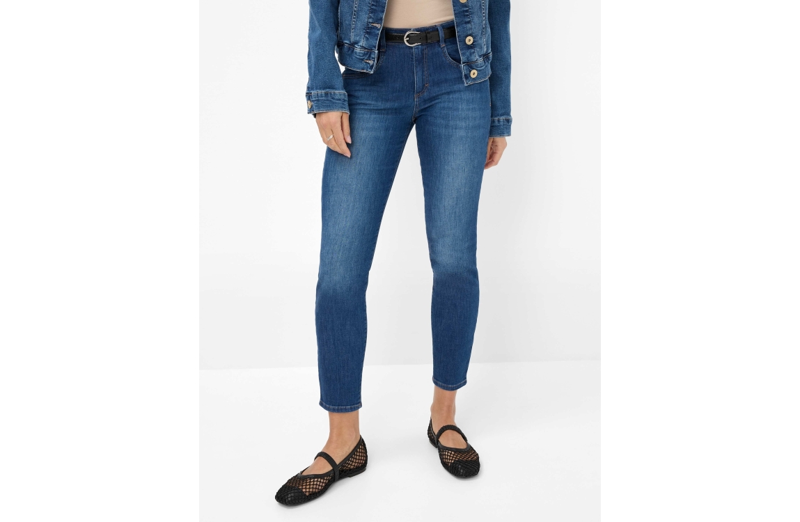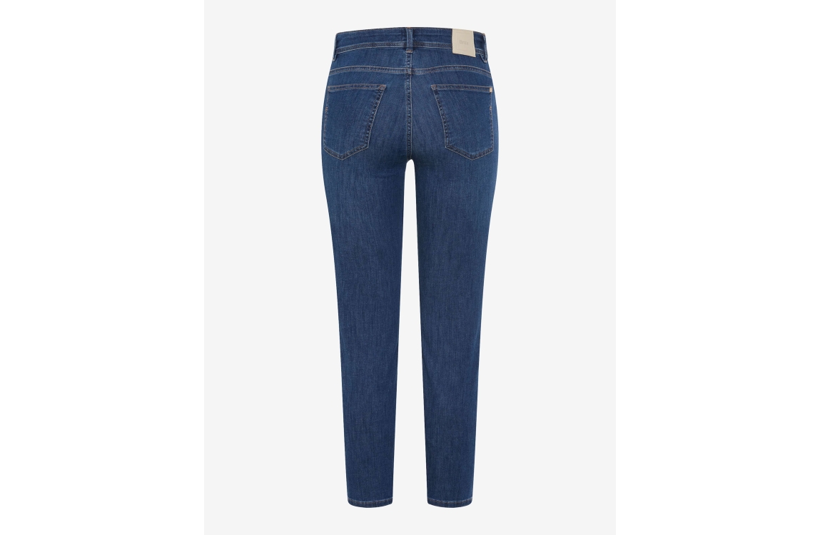 Brax jeans Shakira 71-7928 09933720. Dit slim fit model sluit door middel van een knoop en rits afgewerkt met ceintuurlussen. Deze donkerblauwe jeans van Brax is uitgevoerd in een 5-pocket model.