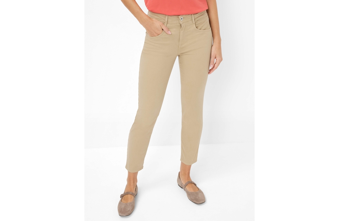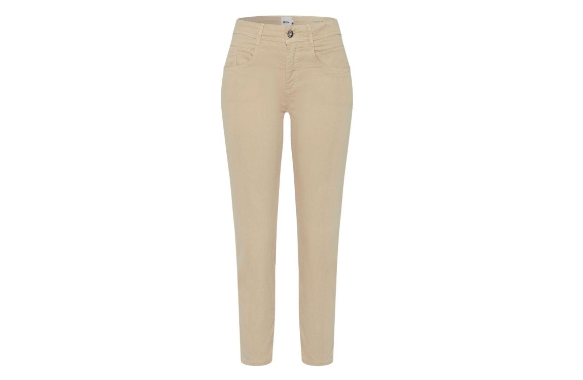 Brax broek Shakira 71-7948 09933720. Dit slim fit model sluit door middel van een knoop en rits afgewerkt met ceintuurlussen. Deze beige 7/8 broek van Brax is uitgevoerd in een 5-pocket model.
