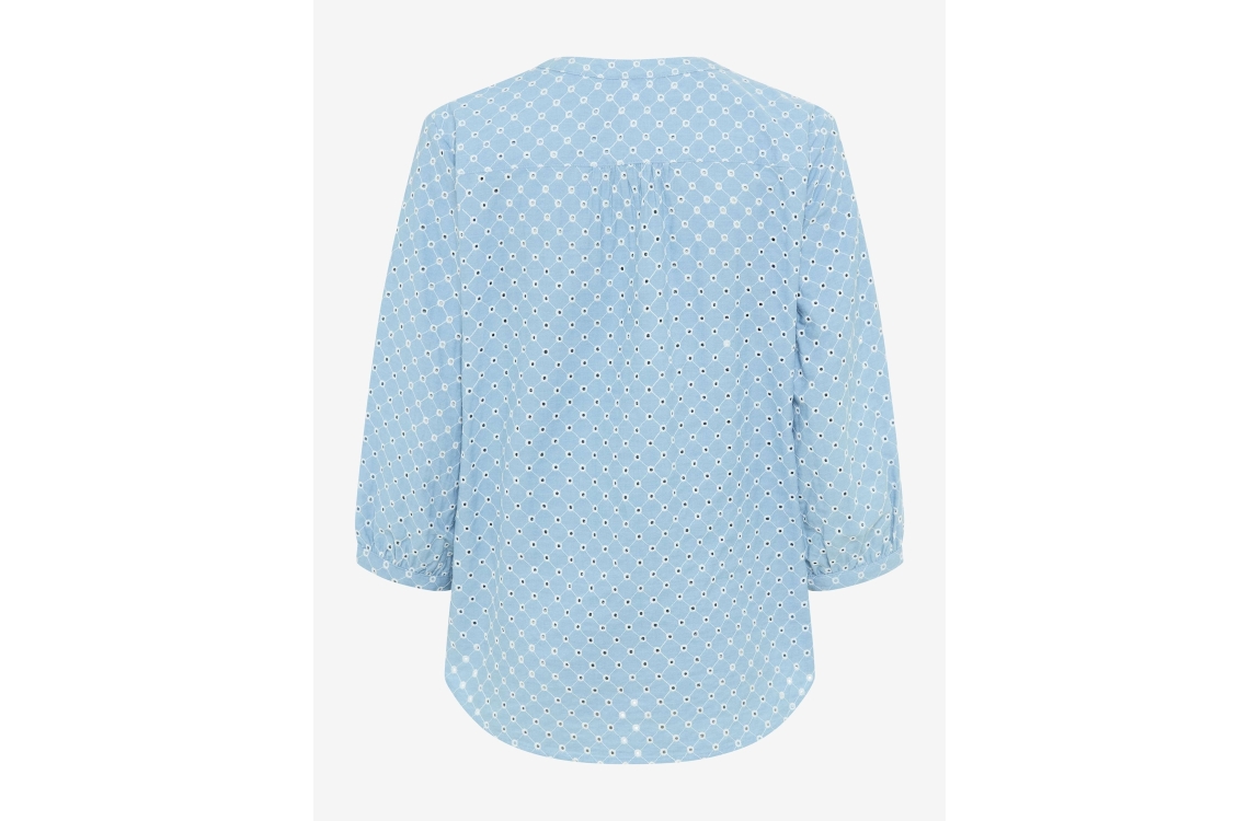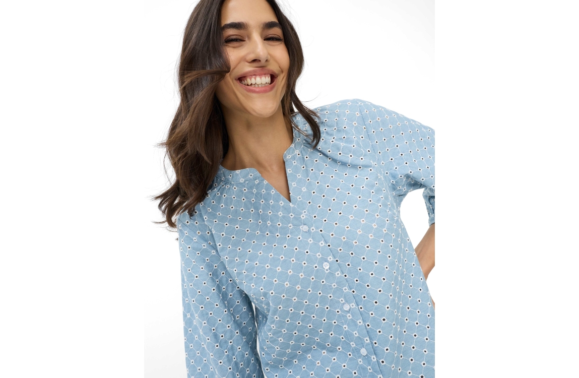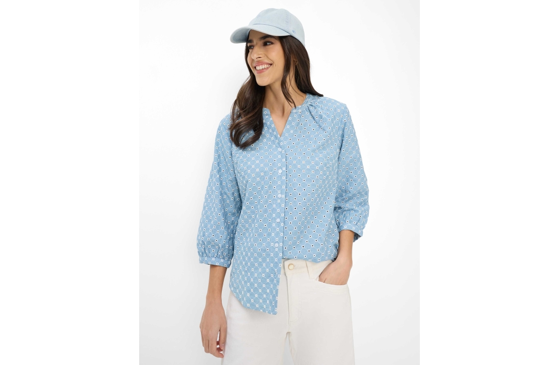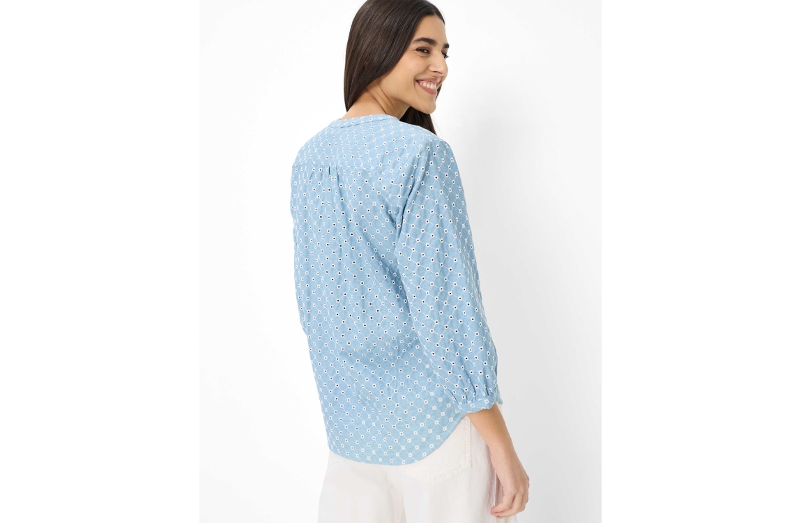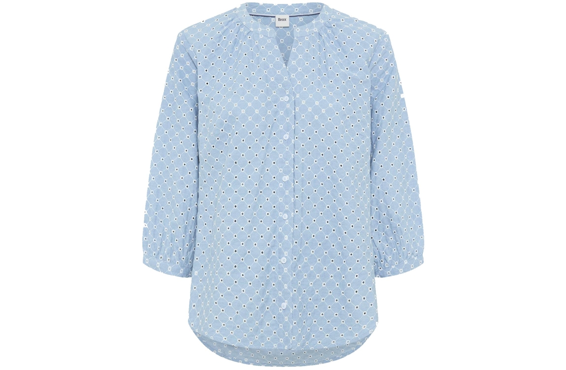 Brax blouse Velia 27. Dit soepelvallende model is voorzien van een ronde hals afgewerkt met een V-inkeping en heeft 7/8 mouwen. Deze lichtblauwe blouse van Brax sluit aan de voorzijde door middel van knopen. Dit model is bewerkt met een geperforeerd motief.