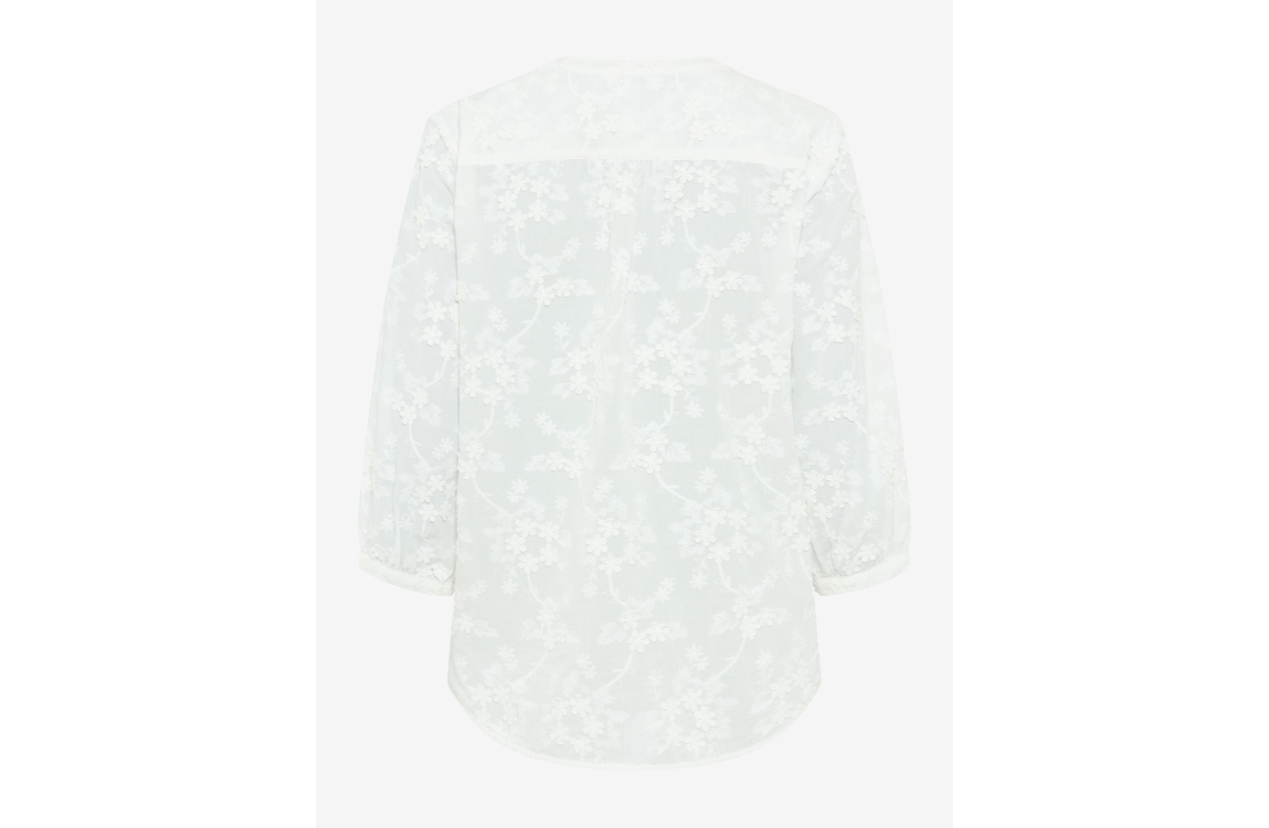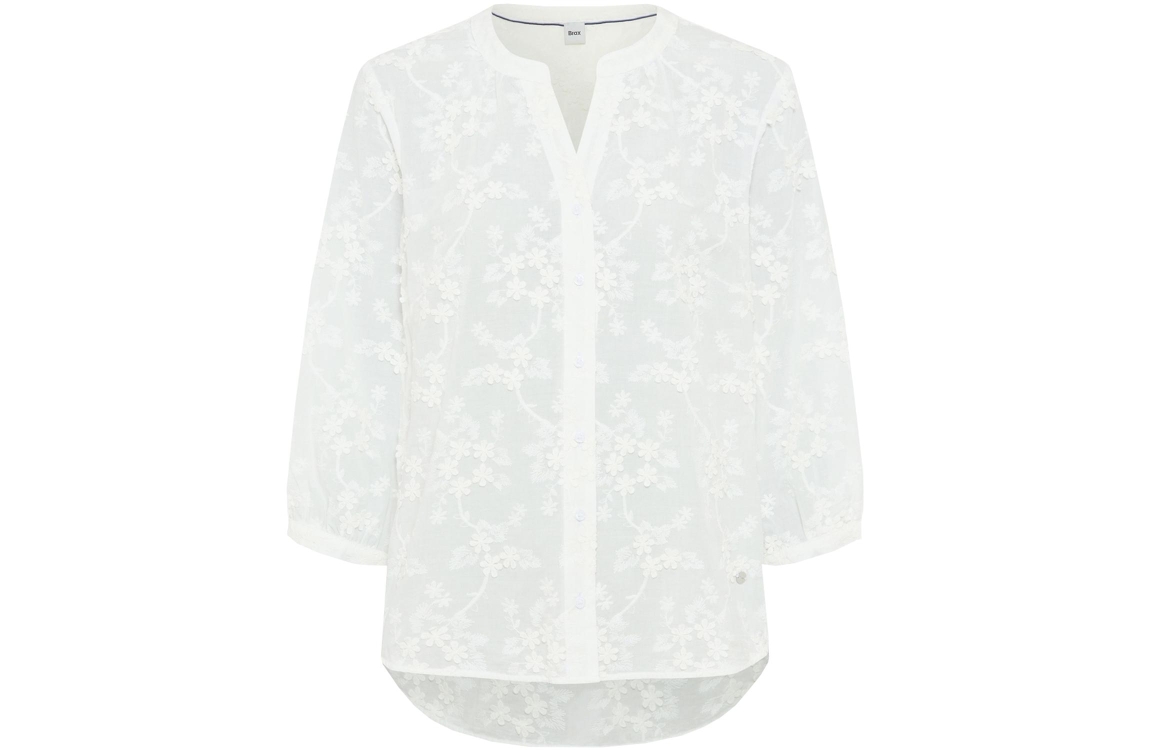 Brax blouse Velia 99. Dit soepelvallende model is voorzien van een ronde hals afgewerkt met een V-inkeping en heeft 7/8 mouwen. Deze witte blouse van Brax sluit aan de voorzijde door middel van knopen. Dit model is bewerkt met een bloemenbroderie.
