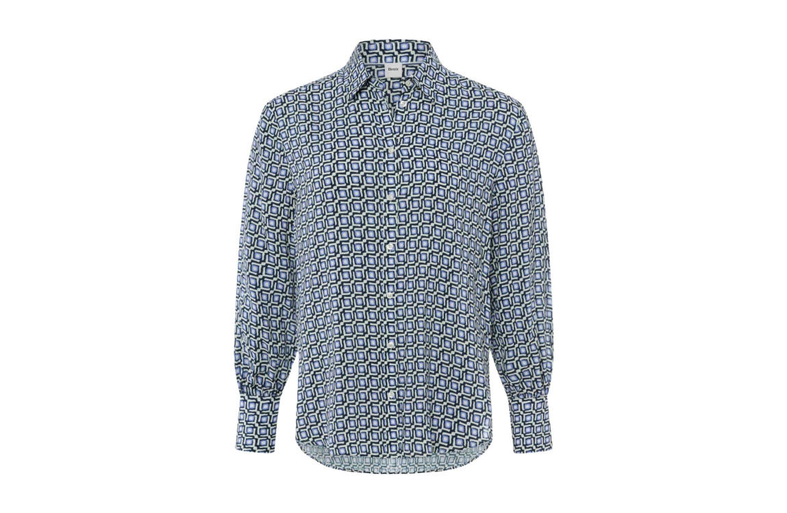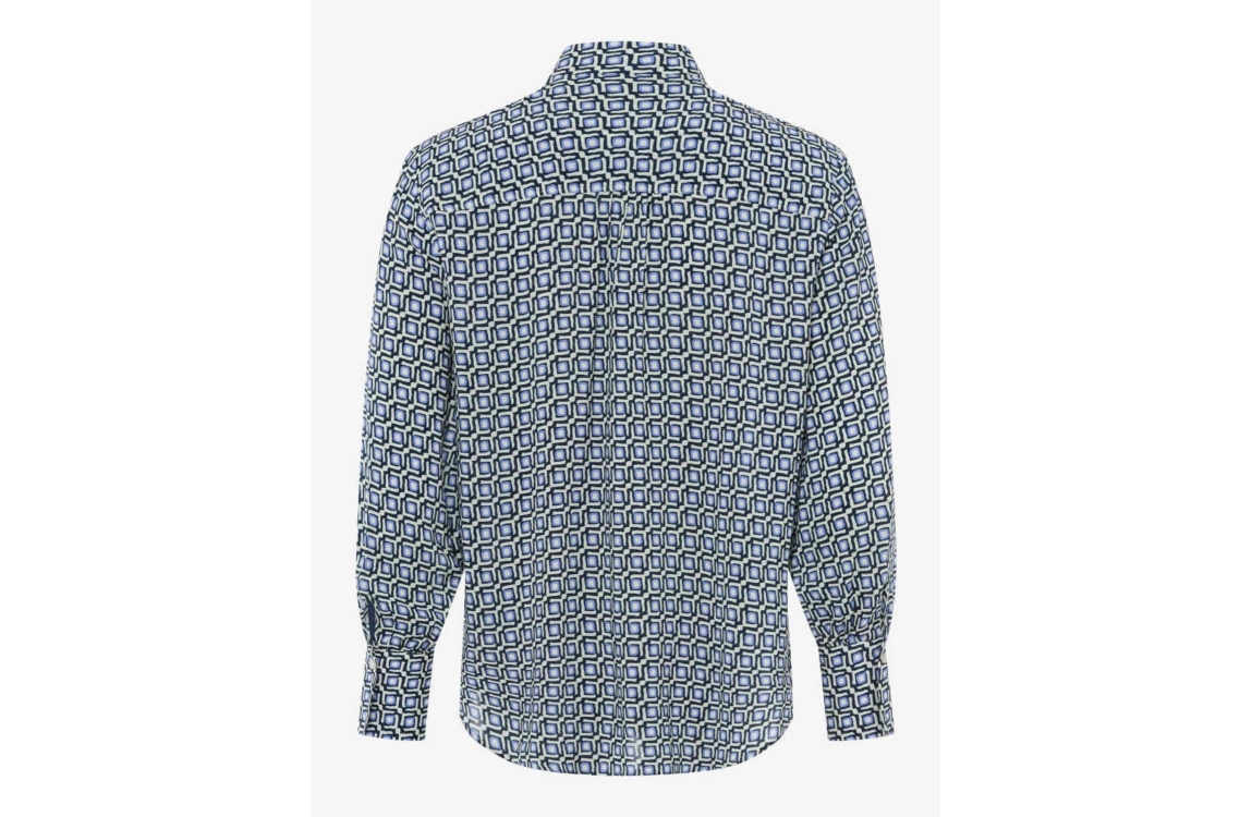 Brax STYLE.VIC 22 Navy. Dit rechtvallende model heeft een kraag en lange mouwen. Deze blauwe blouse van Brax is all-over voorzien van een grafische print en sluit aan de voorzijde met een knoopsluiting.