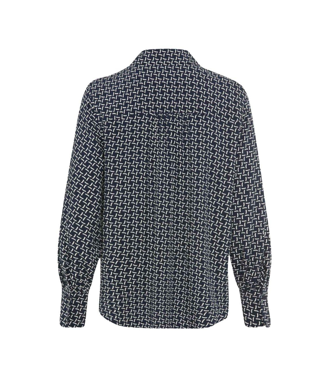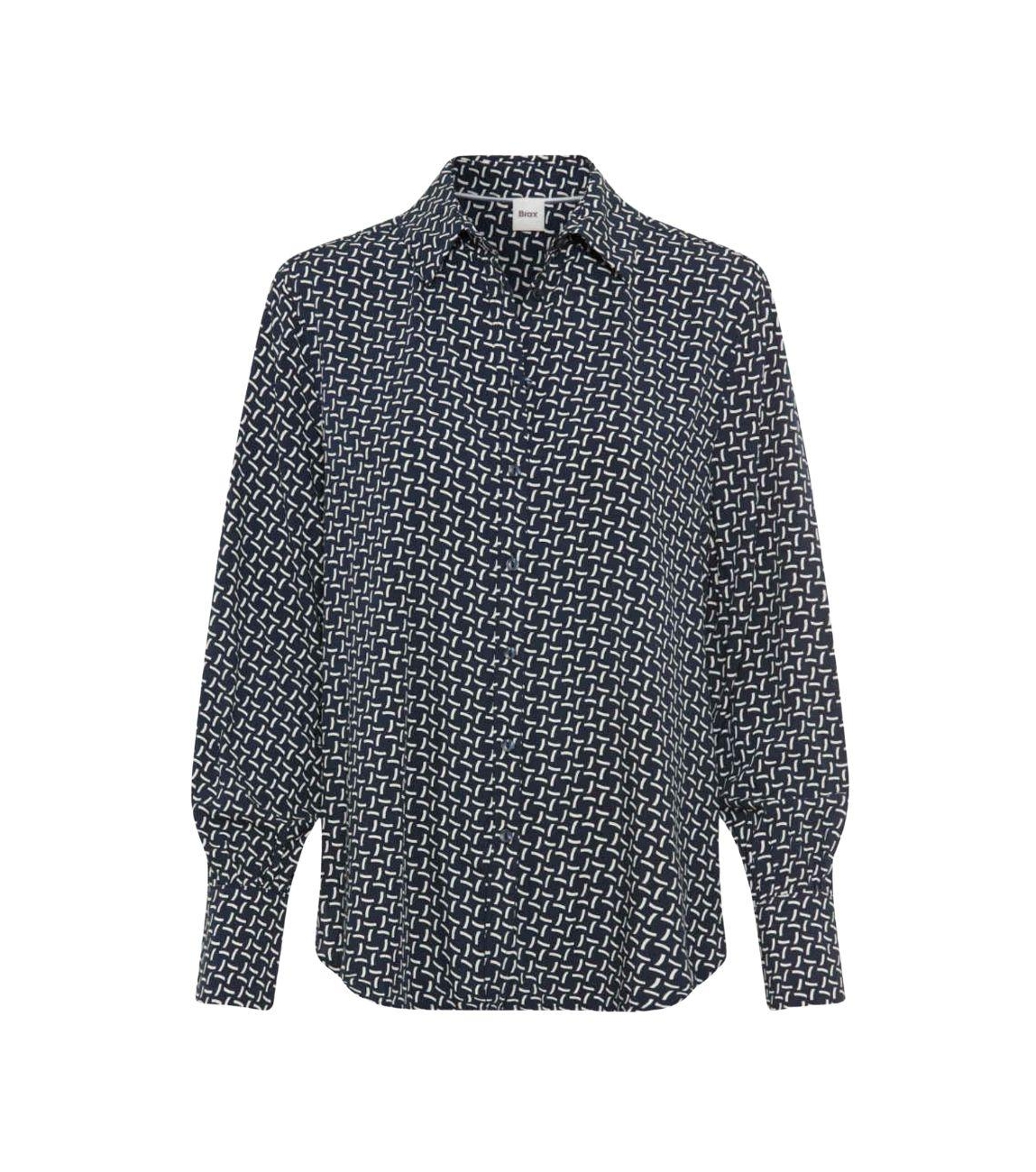 Brax blouse Vic 47-8978 94126000. Dit rechtvallende model heeft een kraag en lange mouwen met manchetten. Deze donkerblauwe blouse van Brax sluit aan de voorzijde door middel van knopen en is ubewerkt met een grafische print.