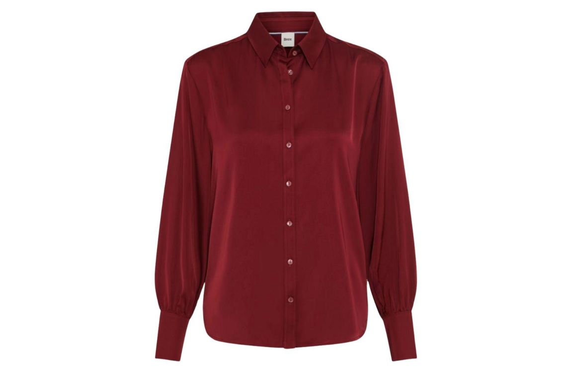 Brax blouse 47-9188 94126000. Dit rechtvallende model heeft een kraag en lange mouwen met manchetten. Deze bordeauxrode blouse van Brax sluit aan de voorzijde door middel van knopen en is uitgevoerd in een satijnen-look