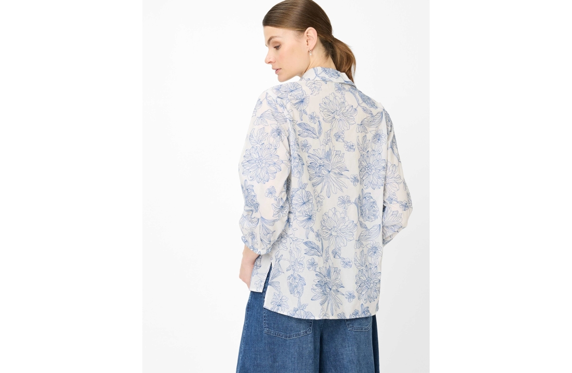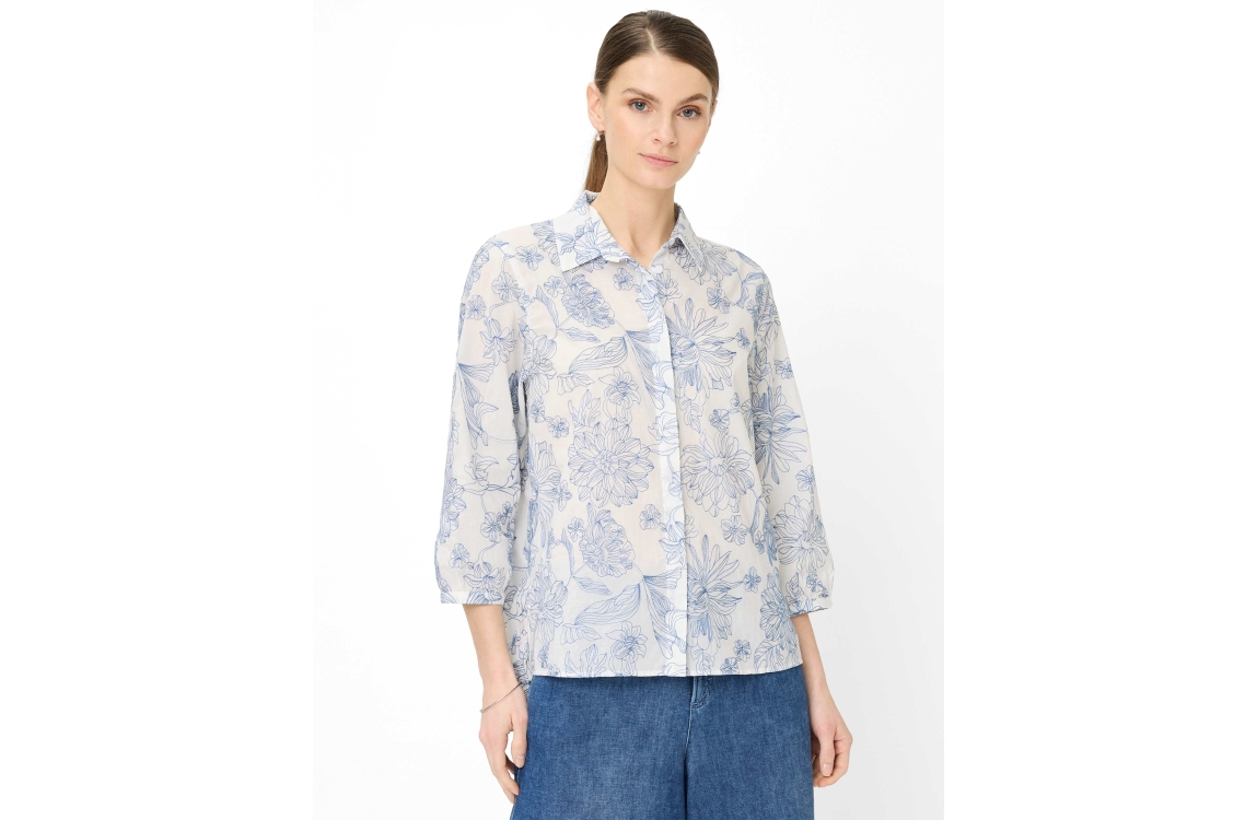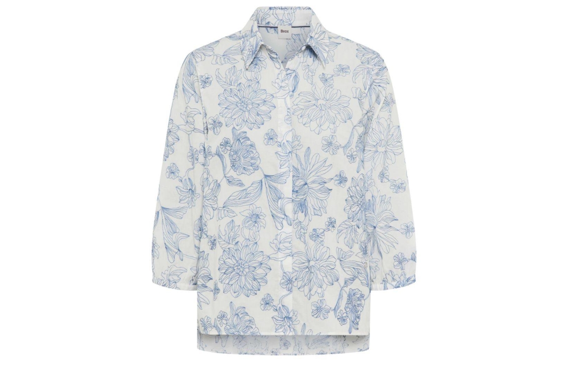 Brax blouse Vicki Vintage Blue 94-0039 94131400. Dit rechtvallend model is voorzien van een kraag en heeft driekwart mouwen. Deze witte blouse van Brax sluit door middel van knopen en is all-over bewerkt met blauw geborduurde bloemenpatroon.