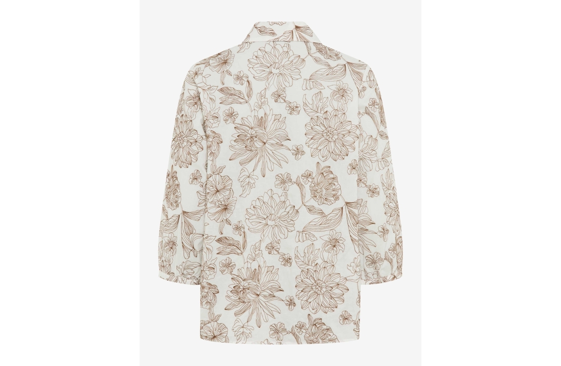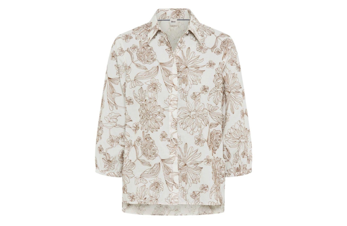 Brax blouse Vicki Mocha Brown 94-0039 94131400. Dit rechtvallend model is voorzien van een kraag en heeft driekwart mouwen. Deze witte blouse van Brax sluit door middel van knopen en is all-over bewerkt met bruin geborduurde bloemenpatroon.
