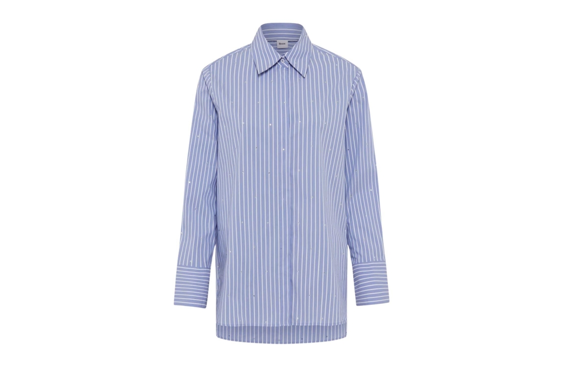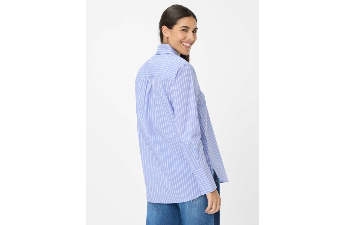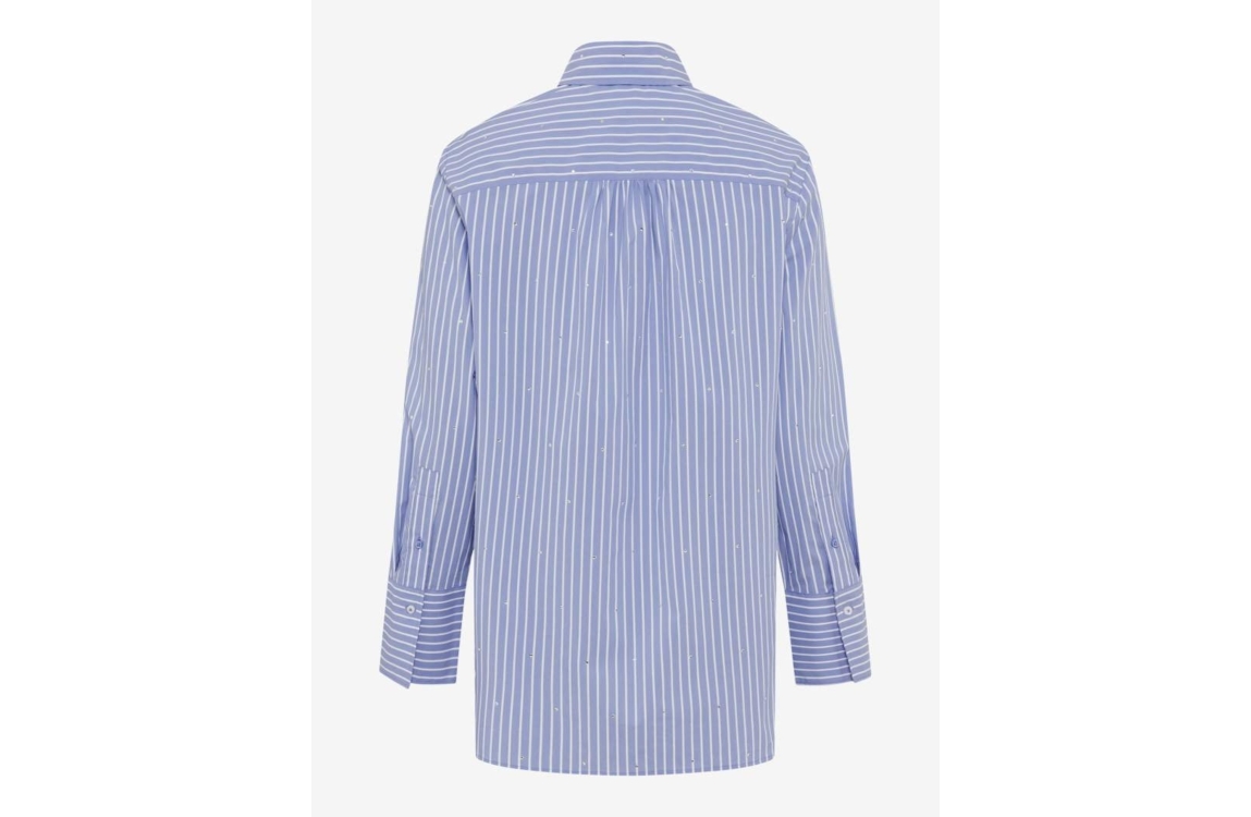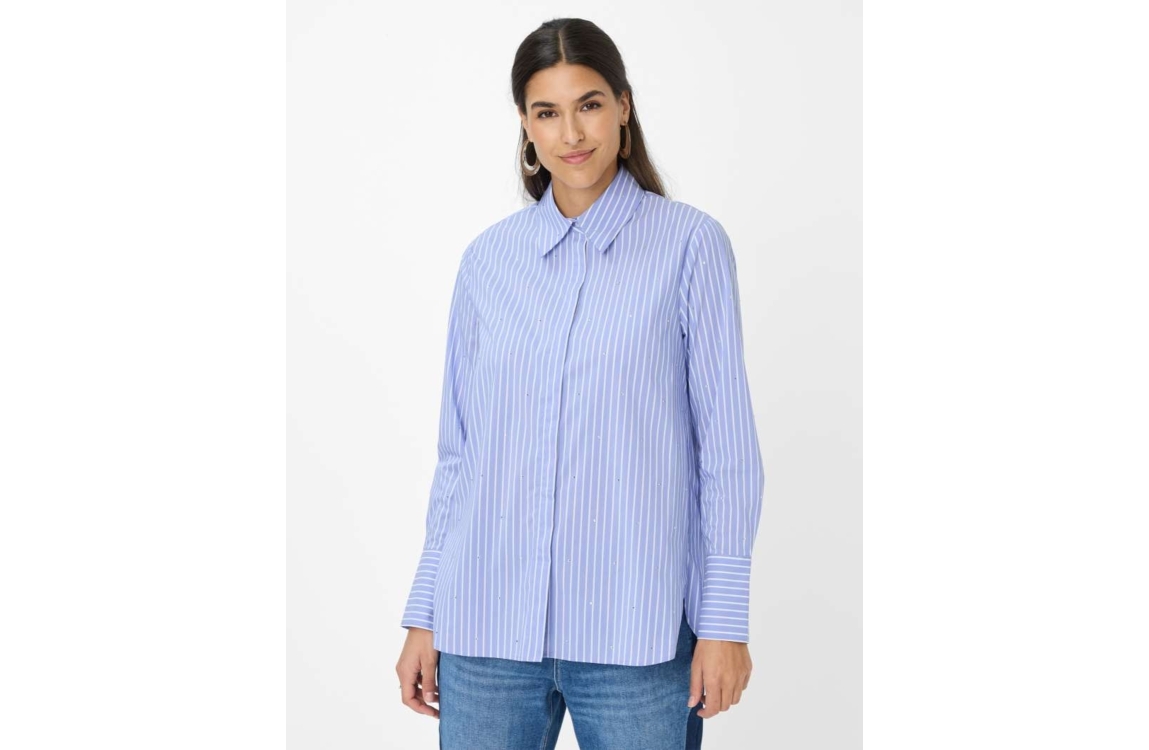 Brax STYLE.VIKI 8585 Violet storm. Dit rechtvallende model heeft een kraag en lange mouwen. Deze blauwe blouse van Brax is bewerkt met een streepprint en is all-over bewerkt met strass-steentjes.