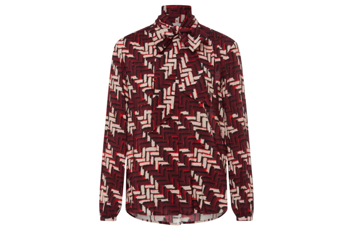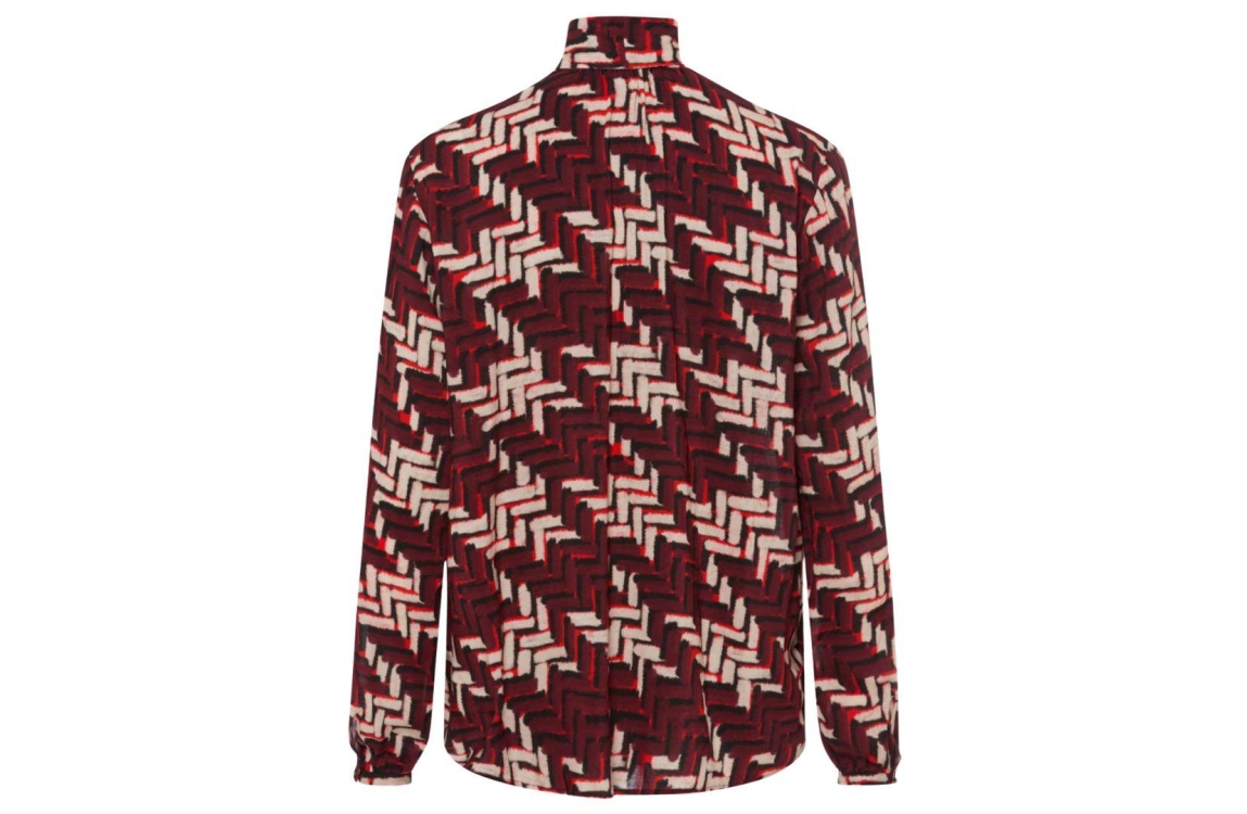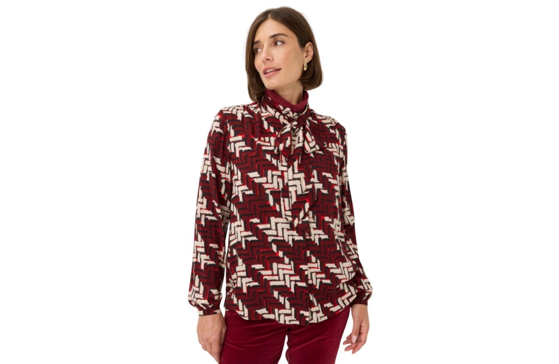 Brax blouse Vivi 47-8788 94171300. Het rechtvallende model heeft een ronde halslijn en lange mouwen. Deze bordeauxrode blouse van Brax is all-over bewerkt met een grafische print in verschillende kleuren en sluit aan de voorzijde door middel van (blinde) knopen. Dit model is voorzien van een strikdetail op de halslijn en heeft afgewerkte boorden.