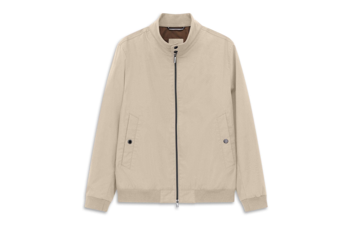 Bugatti HERREN BLOUSON 030. Dit rechtvallende model is voorzien van een opstaande kraag en heeft lange mouwen. Deze beige jas van Bugatti sluit door middel van een rits en beschikt over twee steekzakken met knoop. Dit model is afgewerkt met boorden.