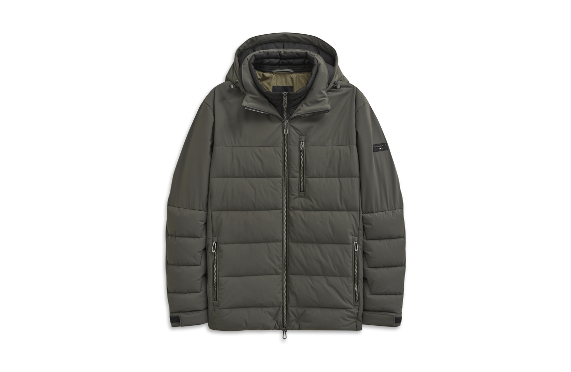 Bugatti jas 81031 873213 270. Dit rechtvallende model heeft een opstaande kraag met een afneembare capuchon en lange mouwen. Deze donkergroene jas van Bugatti sluit aan de voorzijde met een ritssluiting en is voorzien van drie ritszakken. Het model is gedetailleerd met een (uitneembare) onderjas-look aan de voorzijde.