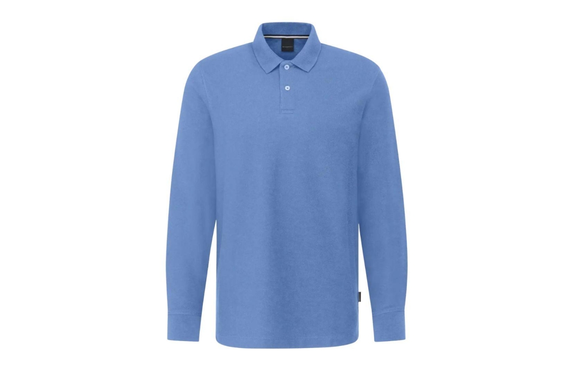 Bugatti polo 75030C 8130. Dit rechtvallend model is voorzien van een kraag en heeft lange mouwen, deze lichtblauwe polo van Bugatti sluit door middel van knopen.