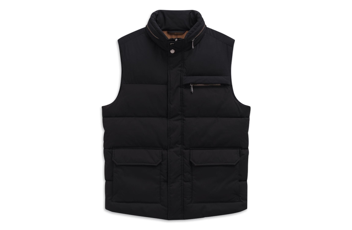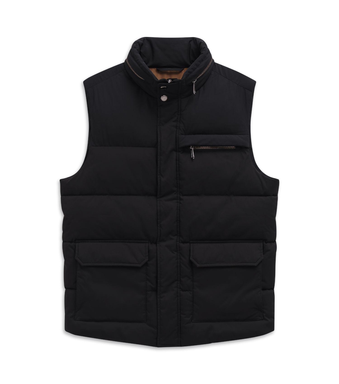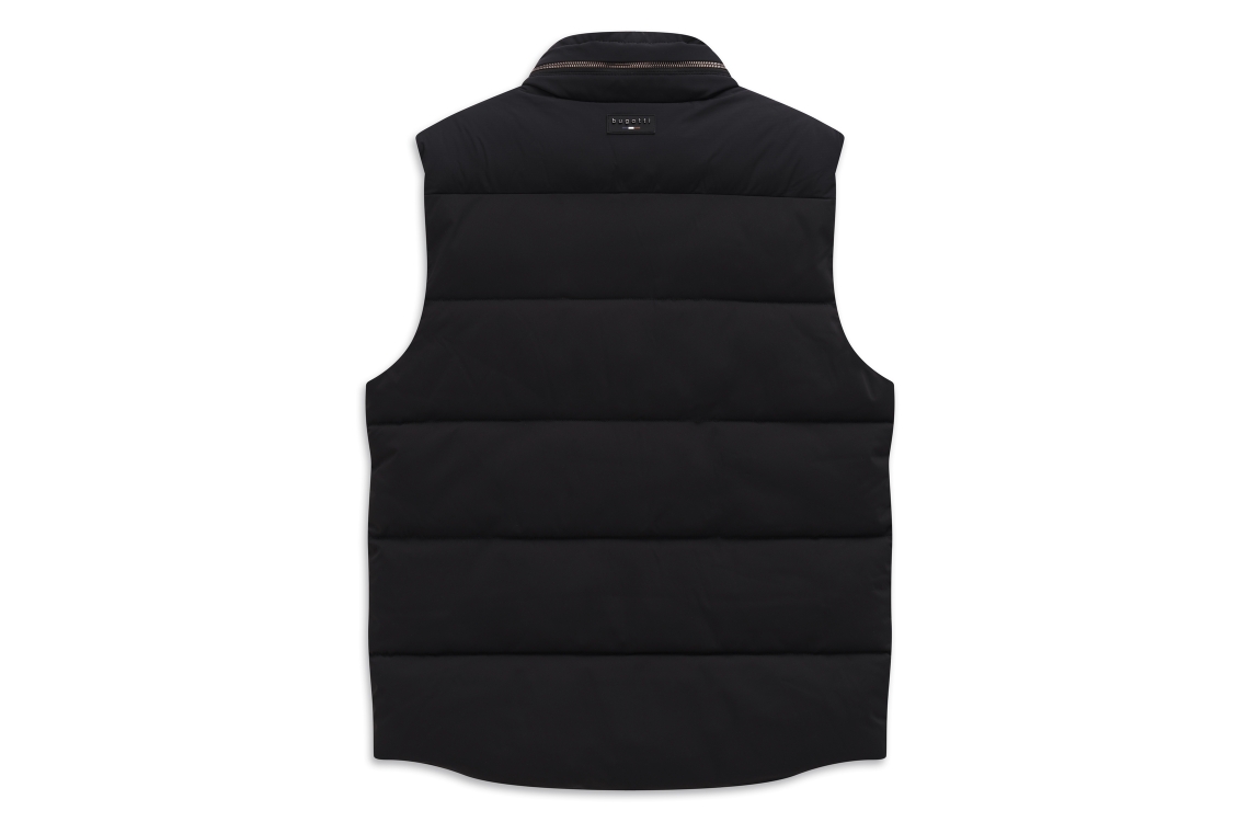 Bugatti HERREN SPORTSWEAR-WESTE 290. Dit rechtvallende model is voorzien van een ronde hals met opstaande kraag en is mouwloos. Deze zwarte bodywarmer van Bugatti sluit door middel van een rits en is afgewerkt met verschillende zakken.