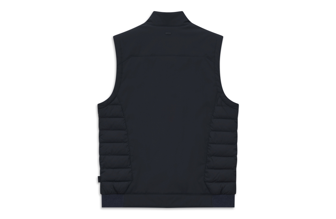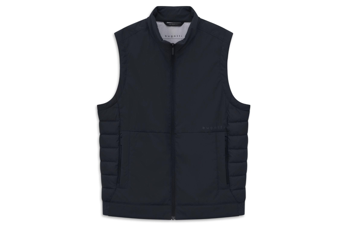 Bugatti HERREN SPORTSWEAR-WESTE 390. Dit rechtvallende model is voorzien van een opstaande kraag en is mouwloos. Deze donkerblauwe bodywarmer van Bugatti sluit door middel van een rits en beschikt over steekzakken met rits en een subtiel Bugatti logo.