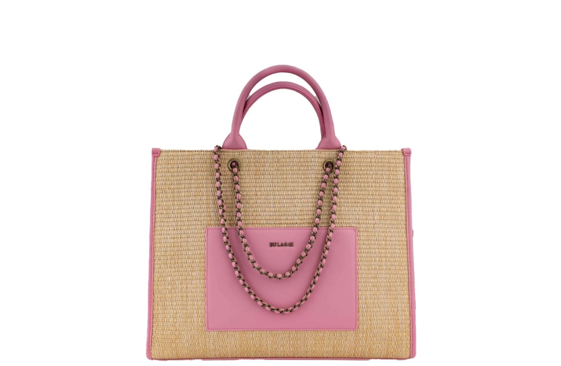 Bulaggi ella shopper 31443. Dit shopper model beschikt over twee hengsels, sluit door middel van een rits en beschikt aan de binnenzijde van twee steekvakken en een ritszak. Deze tas is bewerkt met rieten stof en roze details.