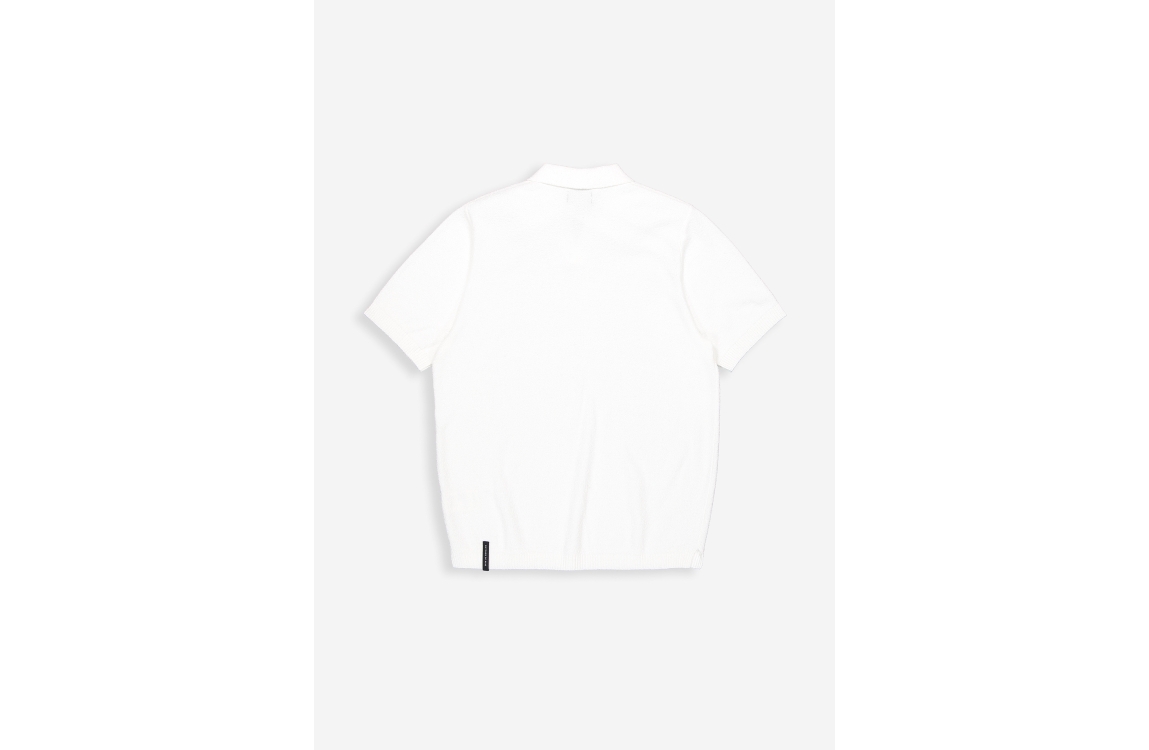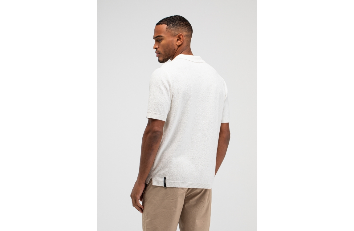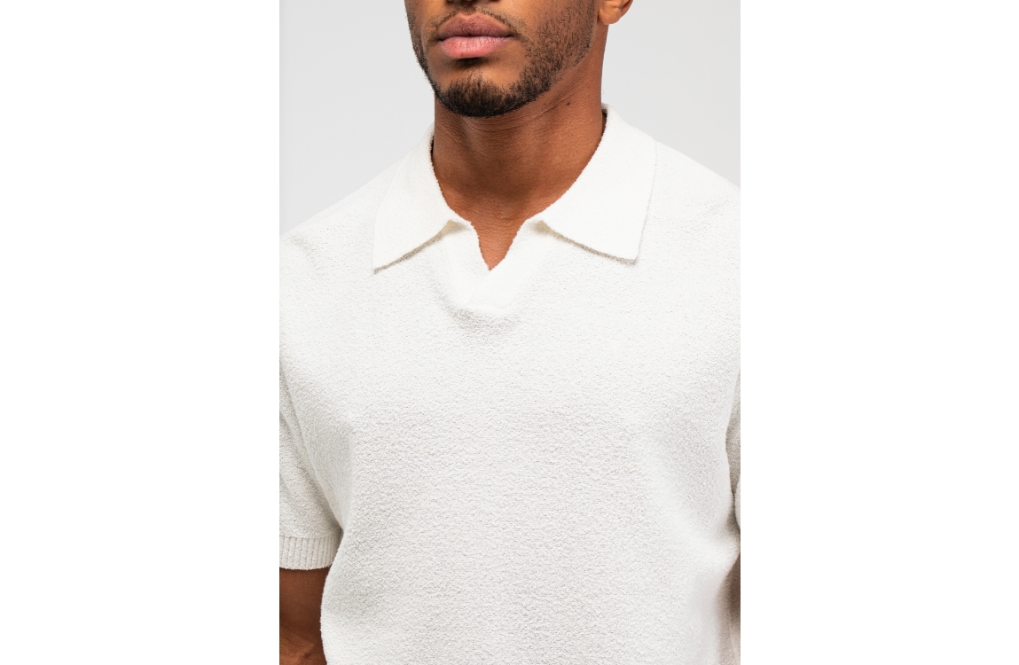Butcher of Blue Boucle Knit Polo 112 titan white. Dit rechtvallende model is voorzien van een kraag en heeft korte mouwen. Deze fijngebreide witte polo van Butcher of Blue is all-over gestructureerd uitgevoerd.