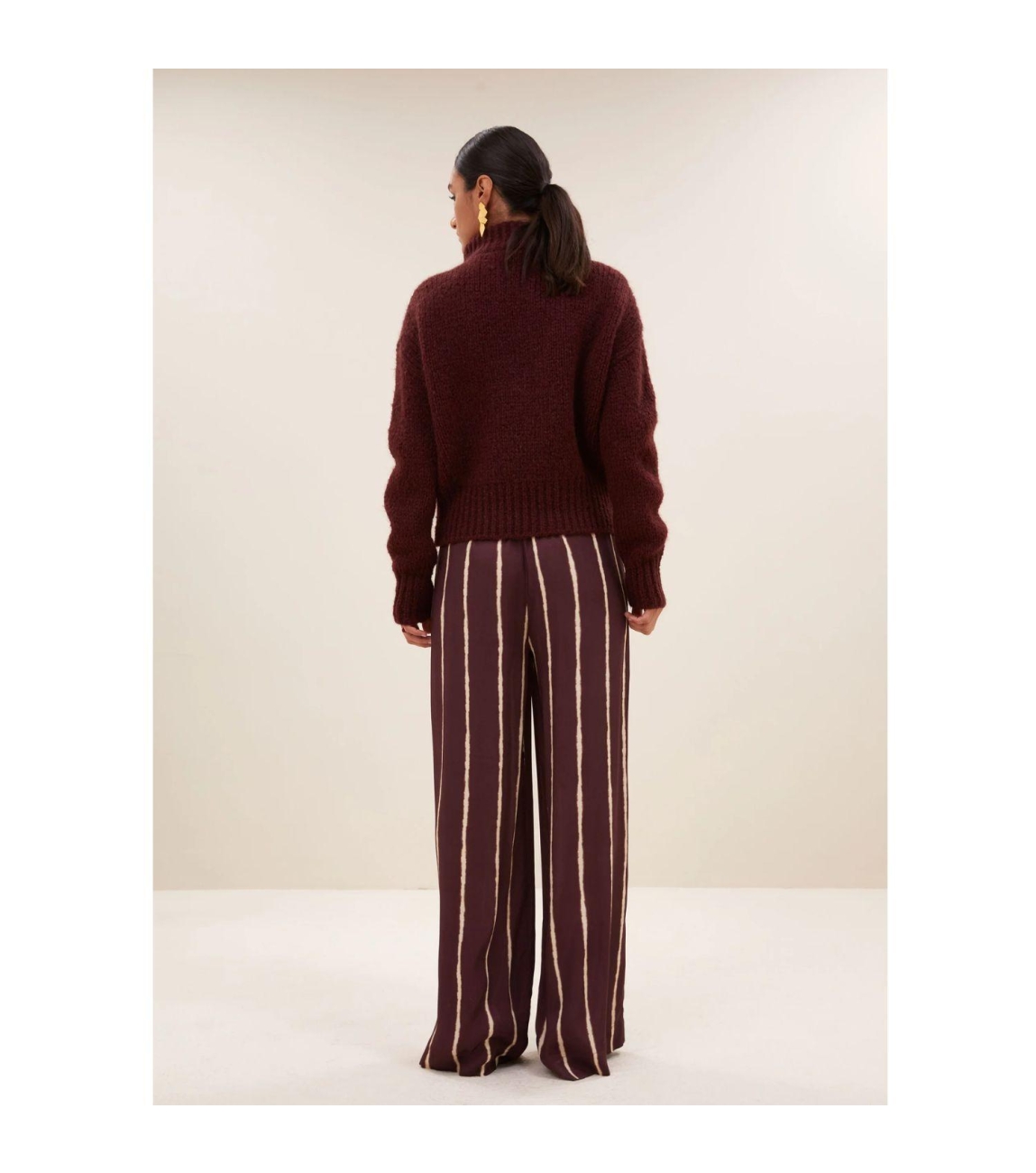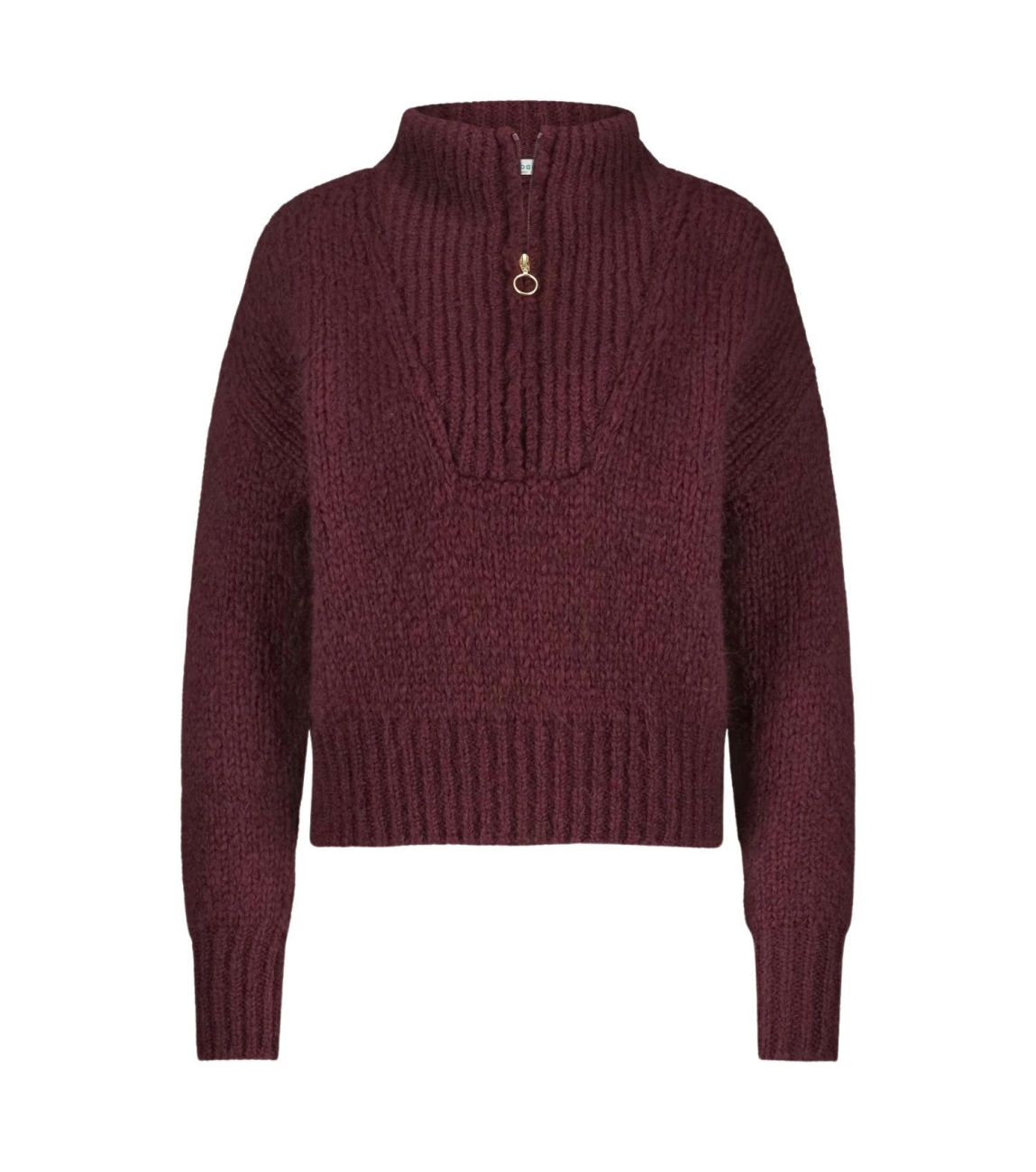 By-Bar Amsterdam Boxy beau pullover 325 Wine. Dit rechtvallende model is voorzien van een ronde hals met een rits. Deze bordeaux rode pullover van By-bar Amsterdam is bewerkt met ribgebreide banden.