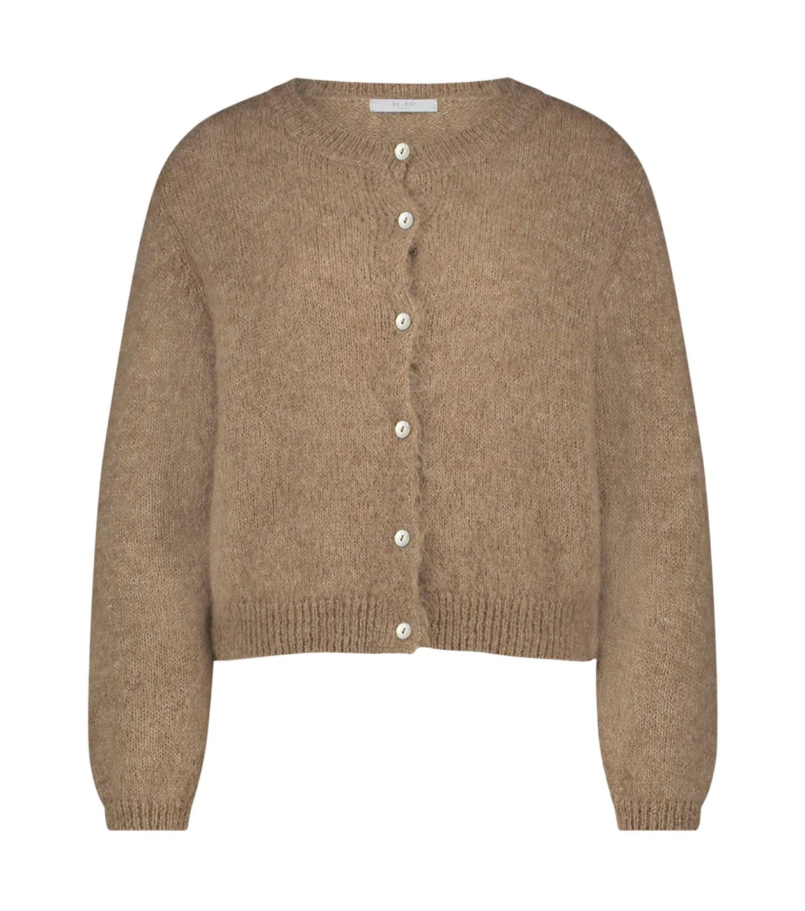 By-Bar Amsterdam 25514004 730. Dit rechtvallende model heeft een ronde halslijn en lange mouwen. Deze lichtbruine cardigan van By-Bar sluit aan de voorzijde door middel van knopen en is afgewerkt met ribgebreide boorden.