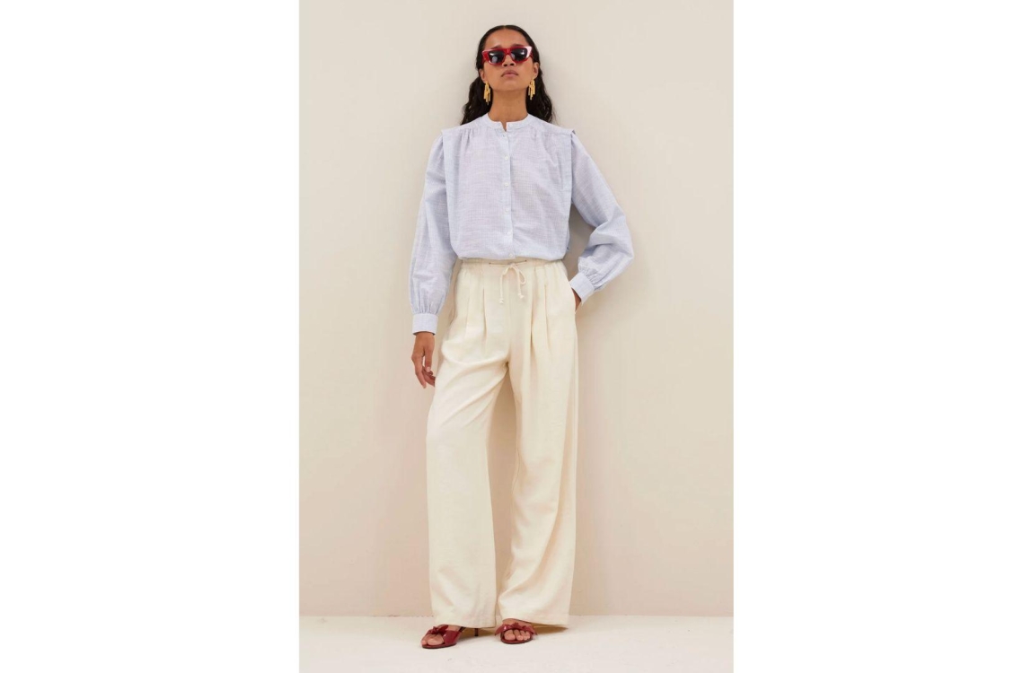 By-Bar Amsterdam Jaxx pants 26218012. Dit wide leg model sluit door middel van een elastische boord met trekkoorden en heeft twee steekzakken aan de voorzijde. Deze crèmekleurige luchtige broek van By-Bar is bewerkt met plooi details aan de voorzijde.