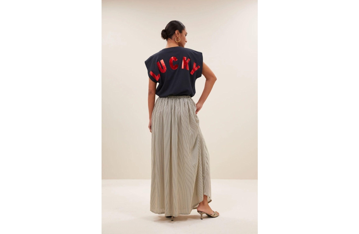 By-Bar Amsterdam Mason Lucky top 856. Dit rechtvallende model heeft kleine kapmouwtjes en een ronde hals. Deze donkerblauwe top van By-Bar is voorzien van een glanzende print op de achterzijde. Het model is 175 centimeter en draagt maat S.