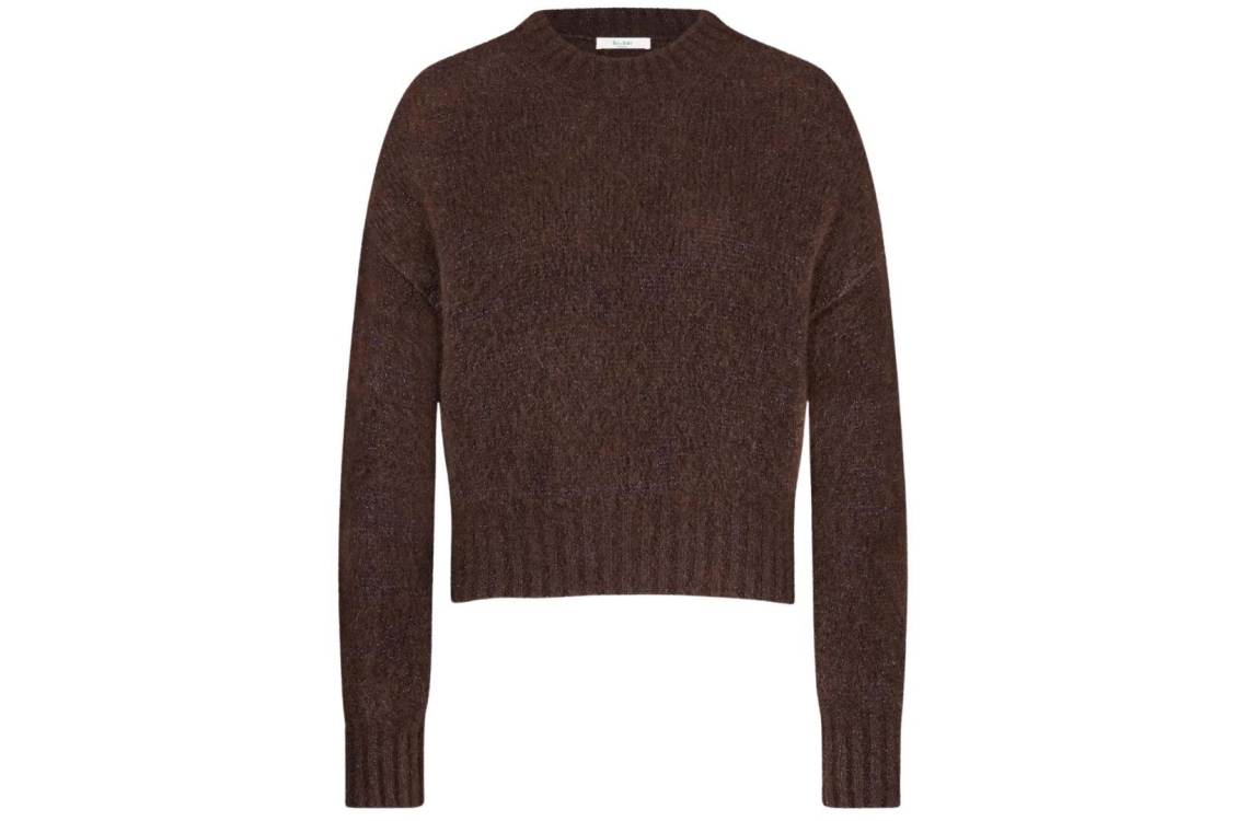 By-Bar trui 25515007. Dit rechtvallende model heeft een ronde halslijn en lange mouwen. Deze donkerbruine trui van By-Bar is all-over bewerkt met een blauwkleurige geweven lurex draad en is gedetailleerd met verlaagde schouders.