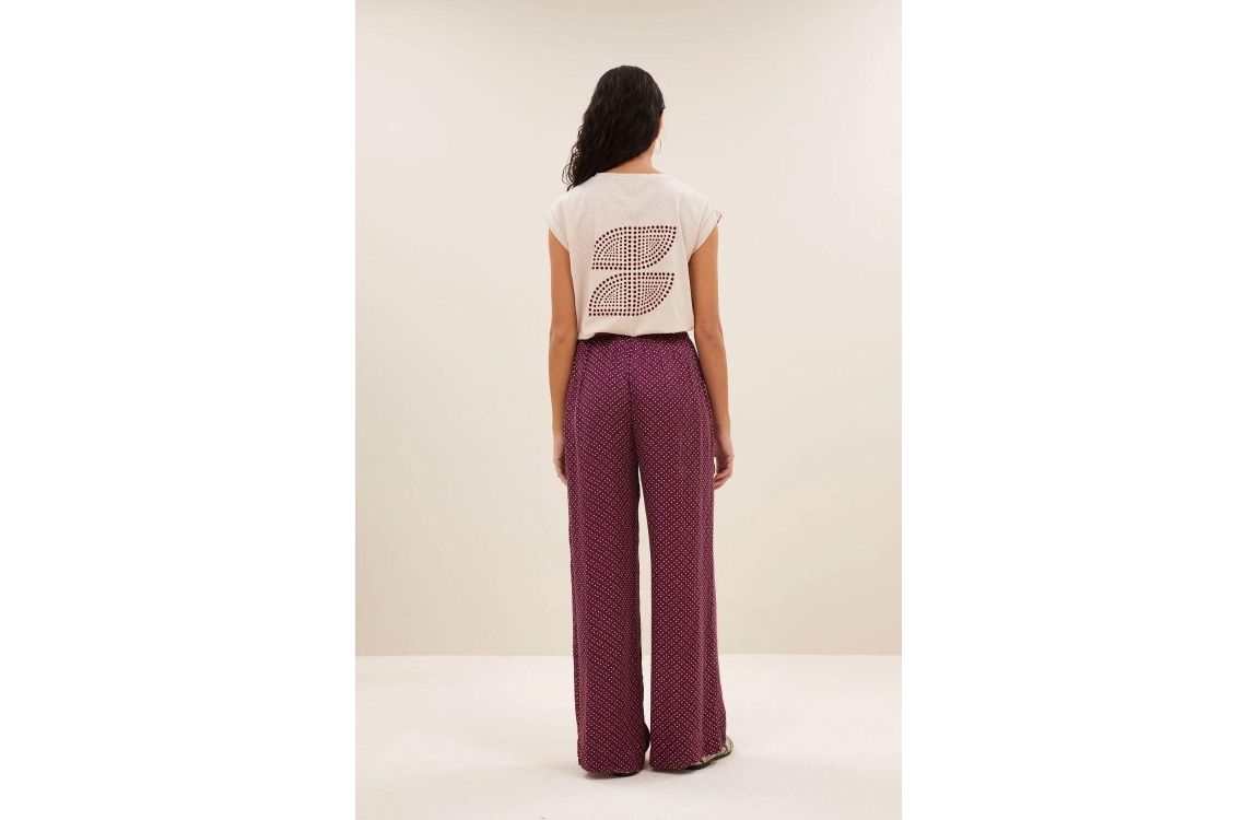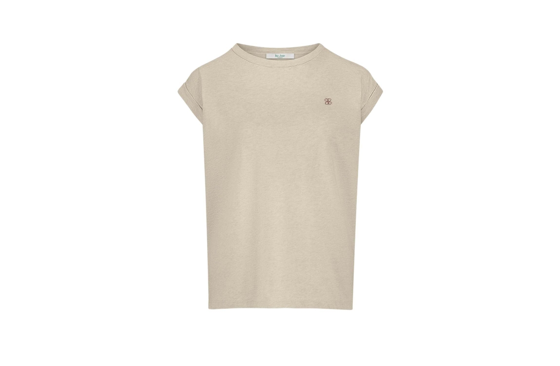 By-Bar Amsterdam Thelma dots logo top 826. Dit rechtvallende model heeft kleine kapmouwtjes en een ronde hals. Deze beige top van By-Bar is voorzien van een opvallende print op de achterzijde. Het model is 175 centimeter en draagt maat S.