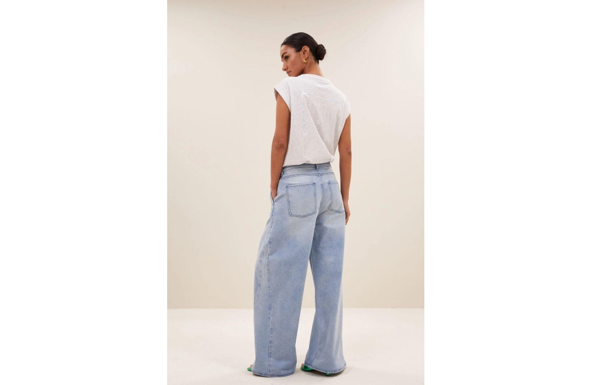 By-Bar Amsterdam Thelma mirror top 815. Dit rechtvallende model heeft kleine kapmouwtjes en een ronde hals. Deze grijze top van By-Bar is voorzien van een uniek graphic patroon op de achterzijde. Het model is 175 centimeter en draagt maat S.