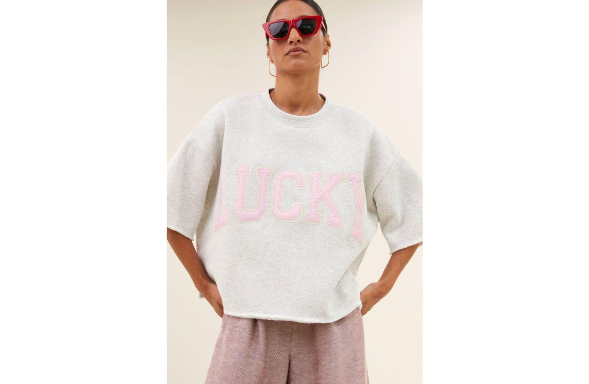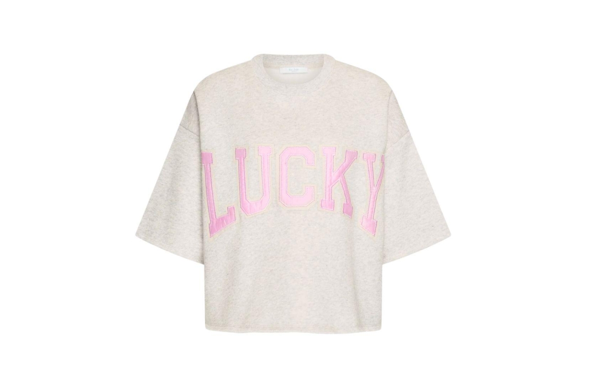 By-Bar Amsterdam willow lucky top 26211009. Dit wijdvallend model heeft een ronde hals en kortemouwen met verlaagde schoudernaden. Deze grijze top van By-Bar Amsterdam is op het voorpand bewerkt met een tekstopdruk 'LUCKY' en is afgewerkt met zijsplitten.
