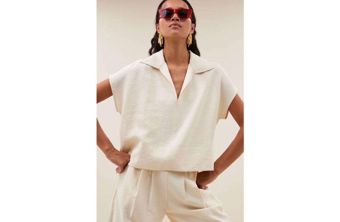 By-Bar Amsterdam blouse Zia 26112023. Dit soepelvallend model is voorzien van een kraag met v-inkeping en heeft korte mouwen. Deze crèmekleurige blouse van By-Bar is afgewerkt met zijsplitten.