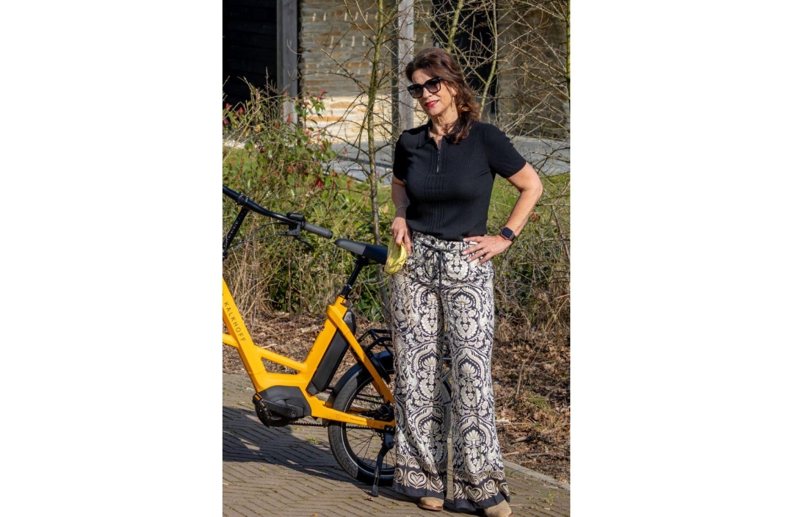 Cambio broek Adrienne 8730-0414-03 830. Dit wide fit model sluit door middel van een knoop- en ritssluiting en is voorzien van een trekkoord. Deze zwarte broek van Cambio is all-over bewerkt met een grafische print in verschillende kleuren en is voorzien van twee steekzakken aan de voor- en achterzijde.